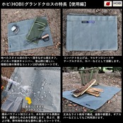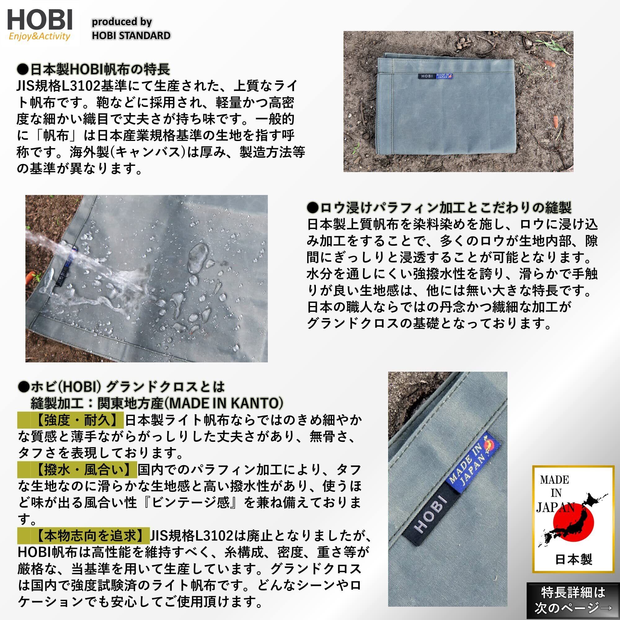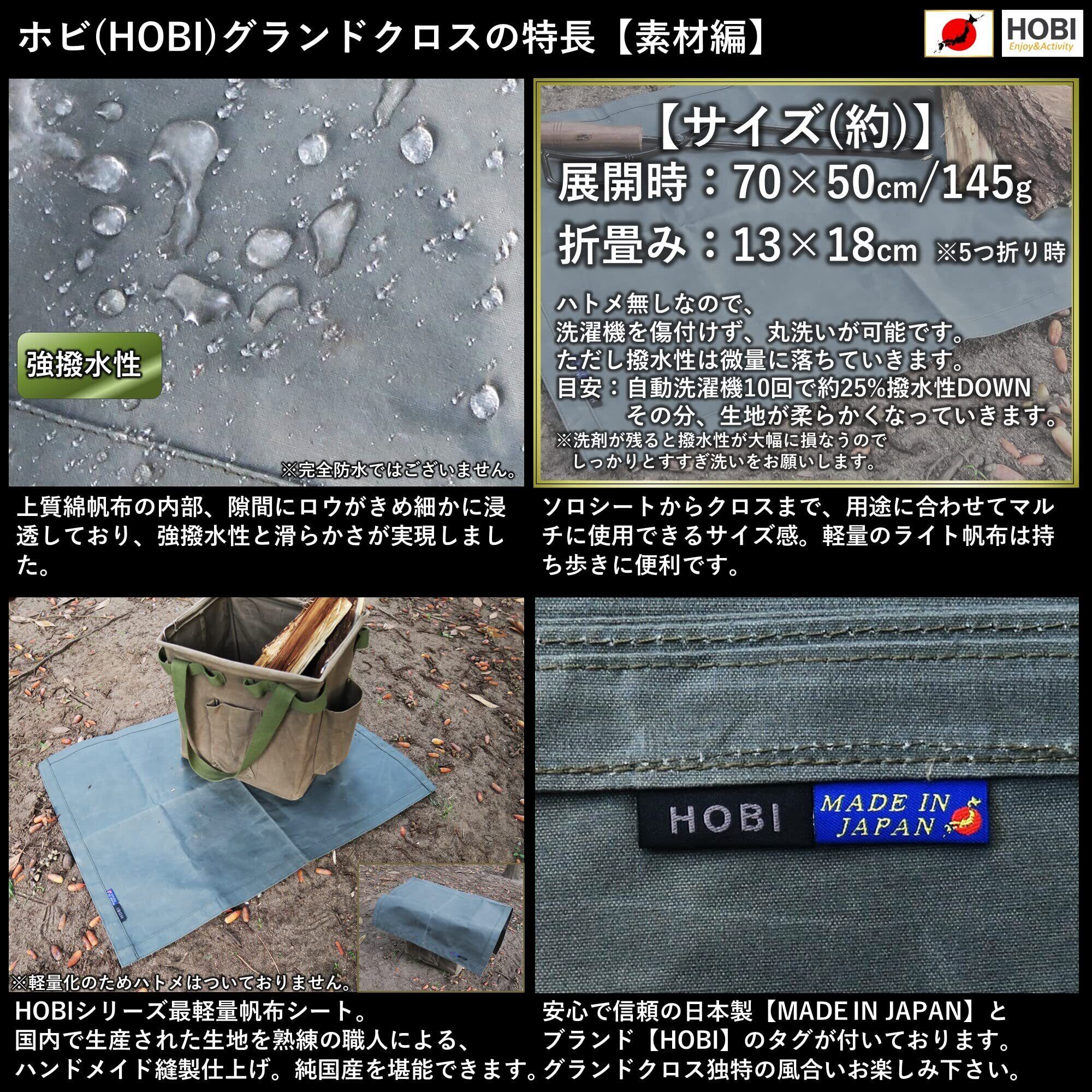 特長①日本製【MADE IN JAPAN】●JIS規格L3102基準に基づいて国内で生地生産。特殊製法により実現した上質ライト帆布とパラフィン加工されたグランドクロスは、高い品質を保っております。JIS規格L3102は廃止となりましたが、HOBI帆布は高性能を維持すべく、糸構成、密度、重さ等が厳格な当基準を用いて生産しております。江戸時代より使用されている頑丈で分厚くしっかりした帆布は軍用テント、救急タンカ、柔道着等に使われ、非常に破けにくい綿100%の環境にやさしい素材です。非常に軽量ながら無骨にガシガシ使用出来、薪束を包んで持ち上げてもびくともしません。特殊なパラフィン(ロウ浸け)加工により高い撥水性を実現し、使い込む程にビンテージ風な雰囲気を表現します。野外、キャンプ、ソロでの様々なシーン、ロケーションに活躍するシートです。