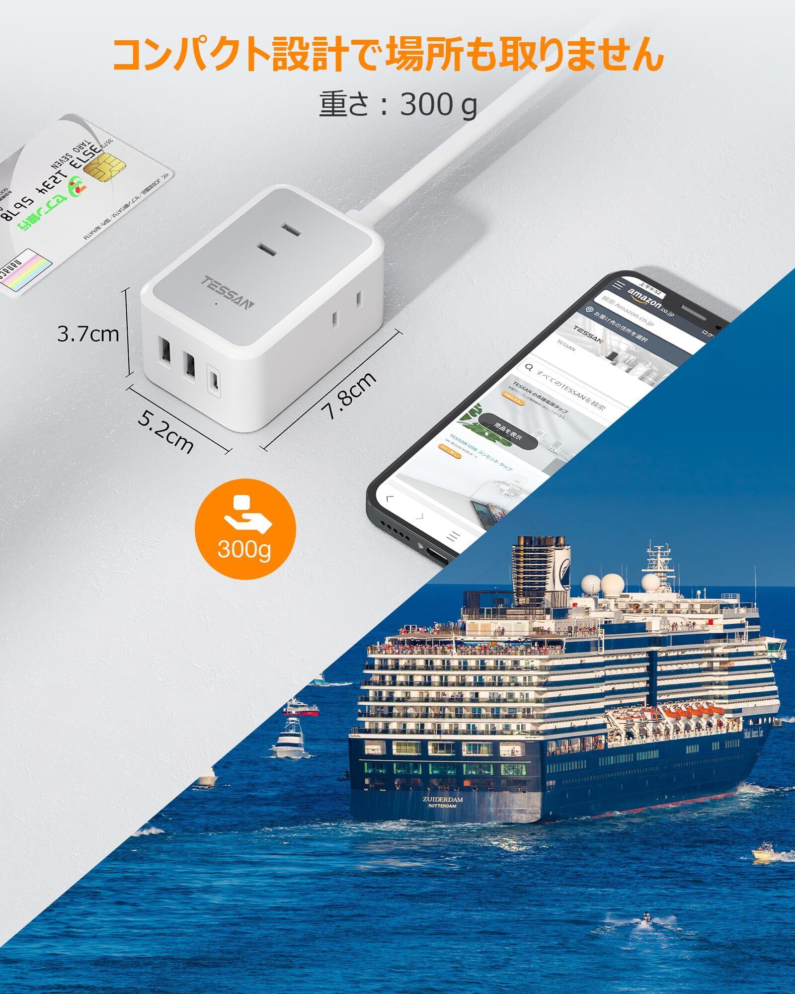 【コンパクトデザイン】サイズわずか5.2x3.7x7.8cm、300gの小型、軽量な電源タップで、場所を取らないコンパクトなデザインなので、持ち運びも楽です。 旅行や出張に最適です。