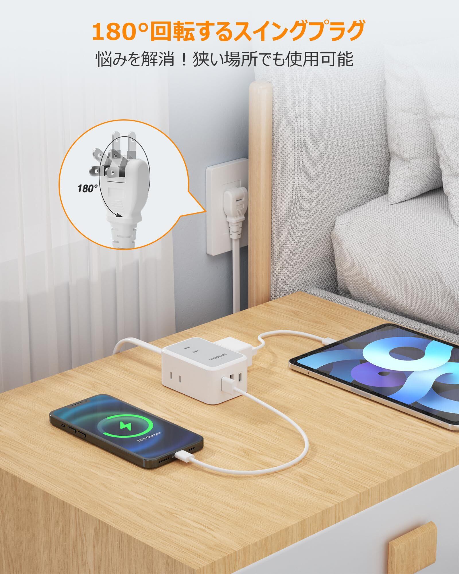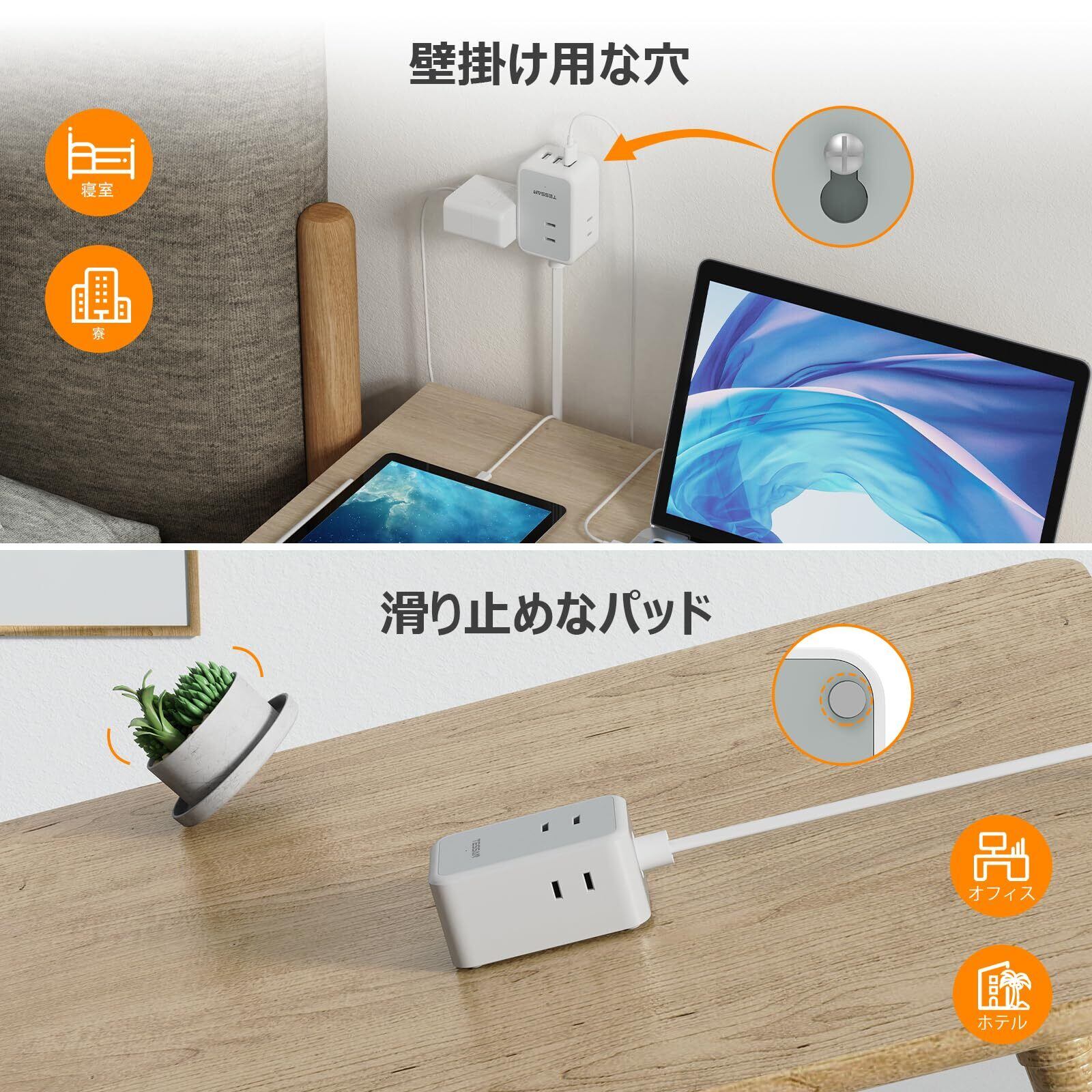 延長コード 2m 電源タップ usb コンセントタップ TESSAN 3個AC口 1タイプC 2タイプA タコ足配線 電源コード マルチ スイングプラグ oa 壁掛 テーブル 小型軽量 出張 旅行