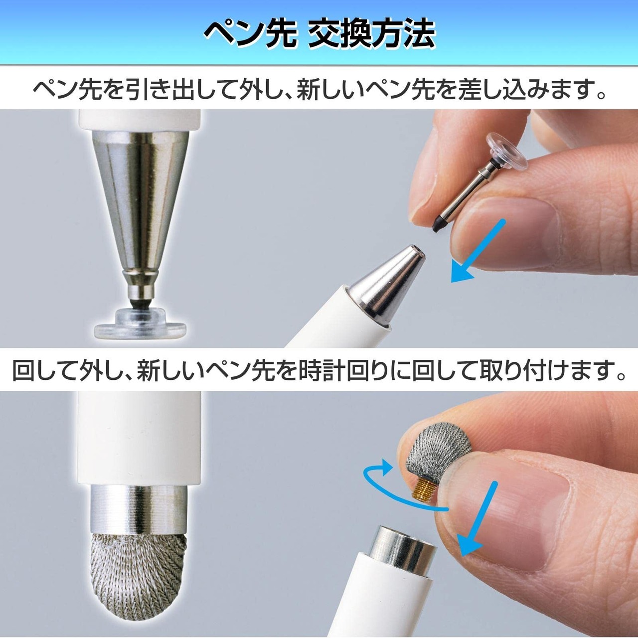 ディスク(平型)と導電繊維(山型)の2種類のペン先!