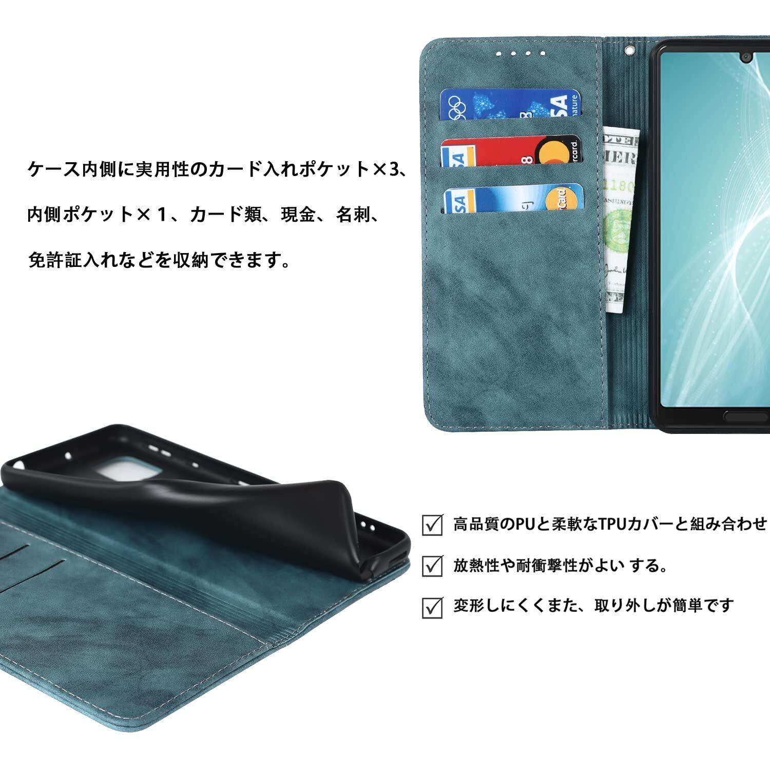 【収納機能】Sense 4/Sense4 lite/Sense4 basic/Sense5Gケース内側に実用性のカード入れポケット×3、内側ポケット×1、カード類、現金、名刺、免許証入れなどを収納でき、通勤も通学にも楽々タイプです。内蔵マグネットの機能を最大限に発揮させ、カードの消磁を防ぐために、カードスロットに2枚のカードをセットすることを推奨します。