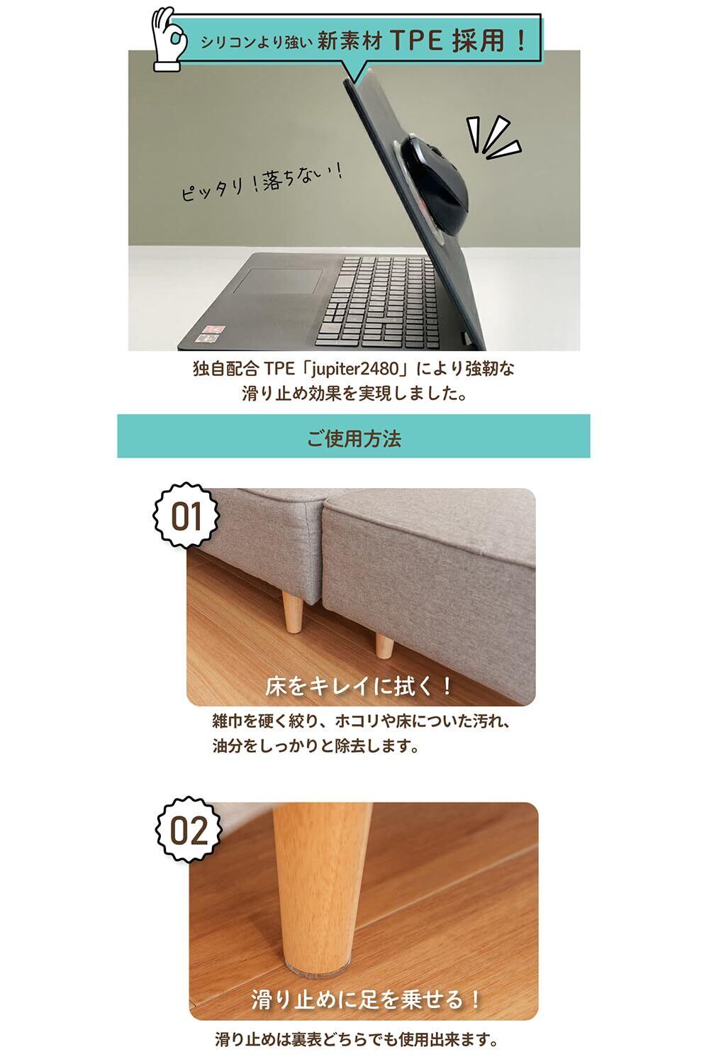 【はみ出さない】ソファの足の形状に合わせたぴったりサイズなので、滑り止めが足からはみ出ません。ペットがかじったり、お掃除ロボットが引っ掛かったりせず、見た目もスッキリおしゃれな ソファ 滑り止め です。