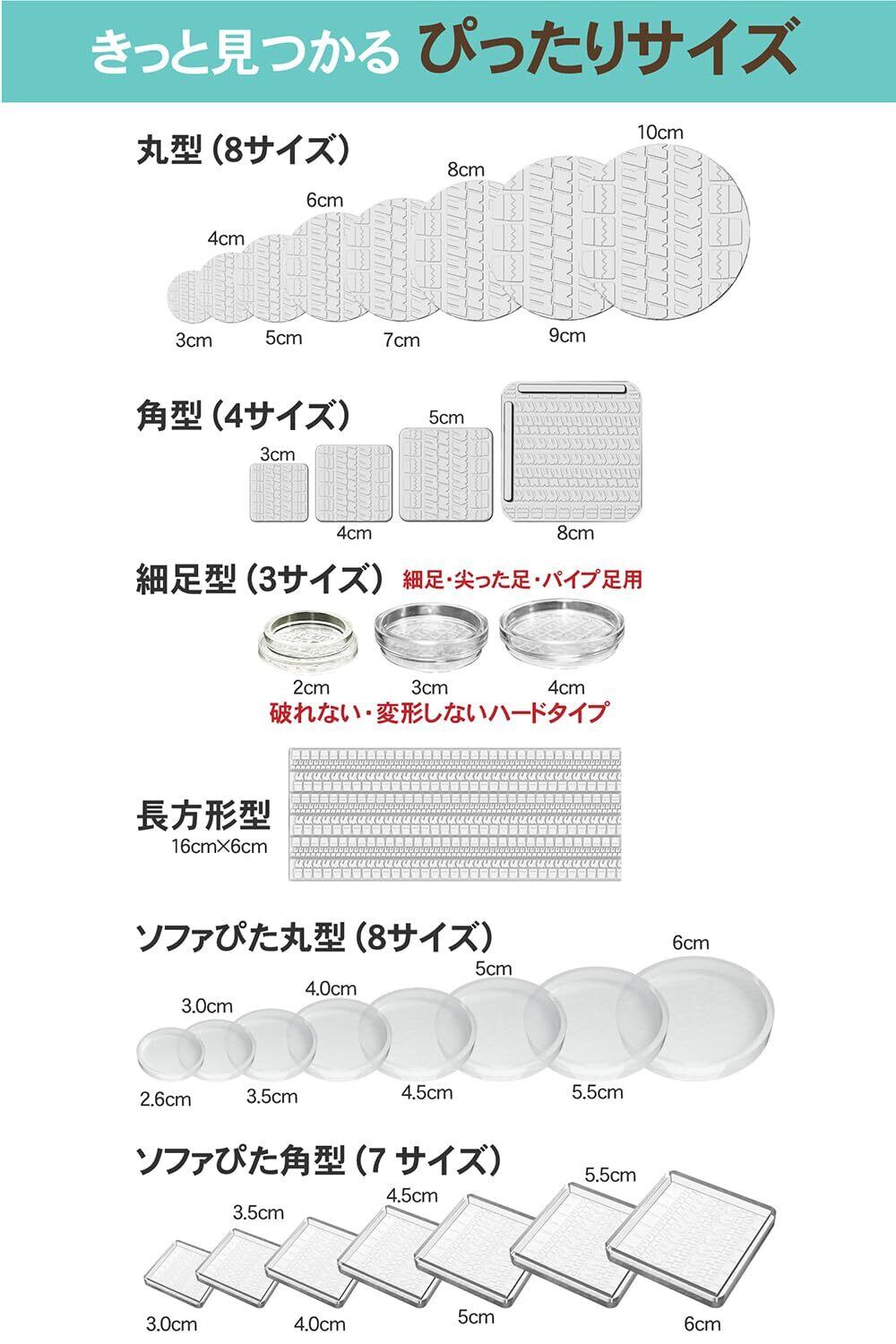【サイズが豊富】ほとんどの ソファ滑り止め は1~3サイズしかラインナップがありません。Shellyの ソファー滑り止め は丸型・正方形型・長方形型・細足専用型の4タイプ全16サイズを取り揃えています。あなたのソファにピッタリサイズの滑り止めがきっと見つかります。