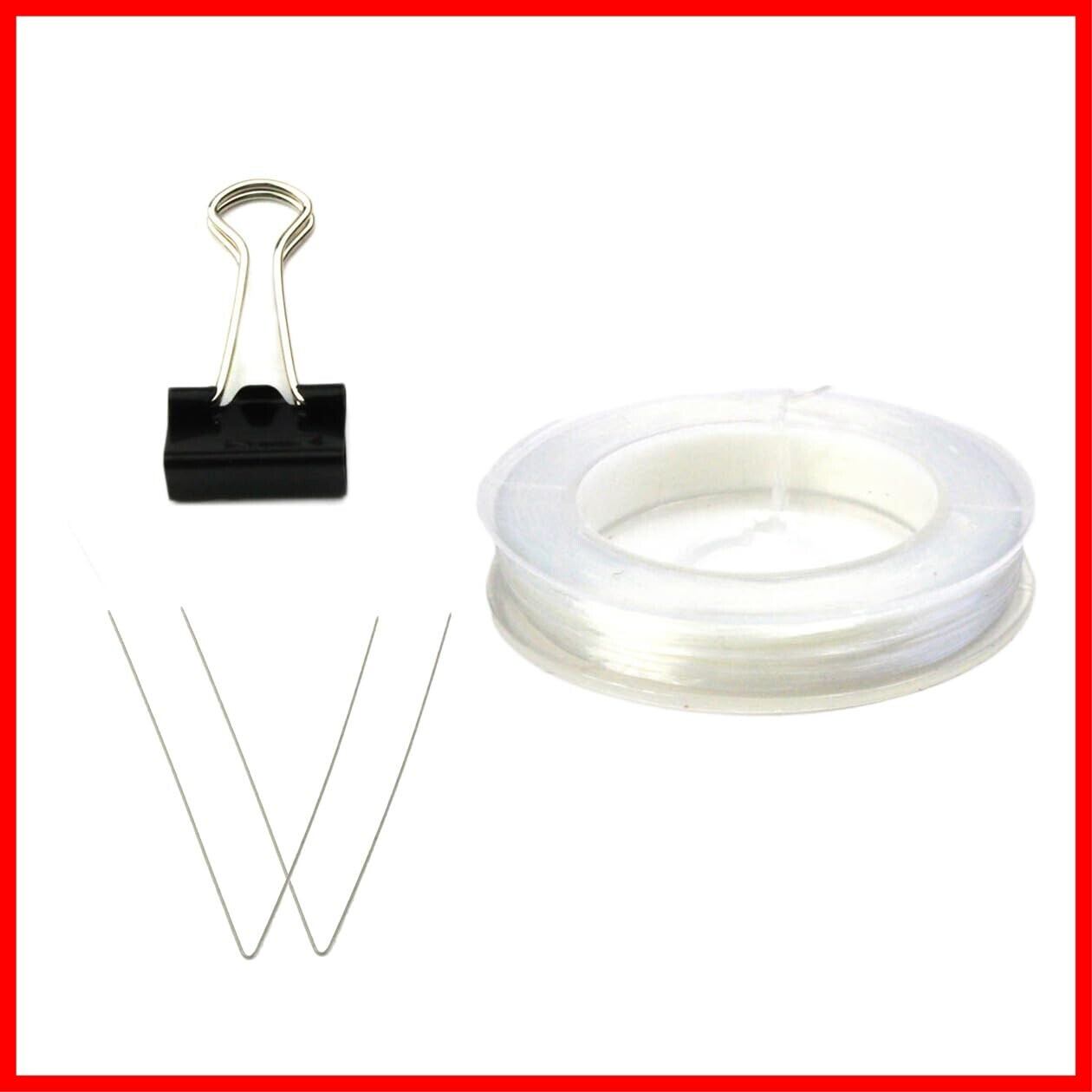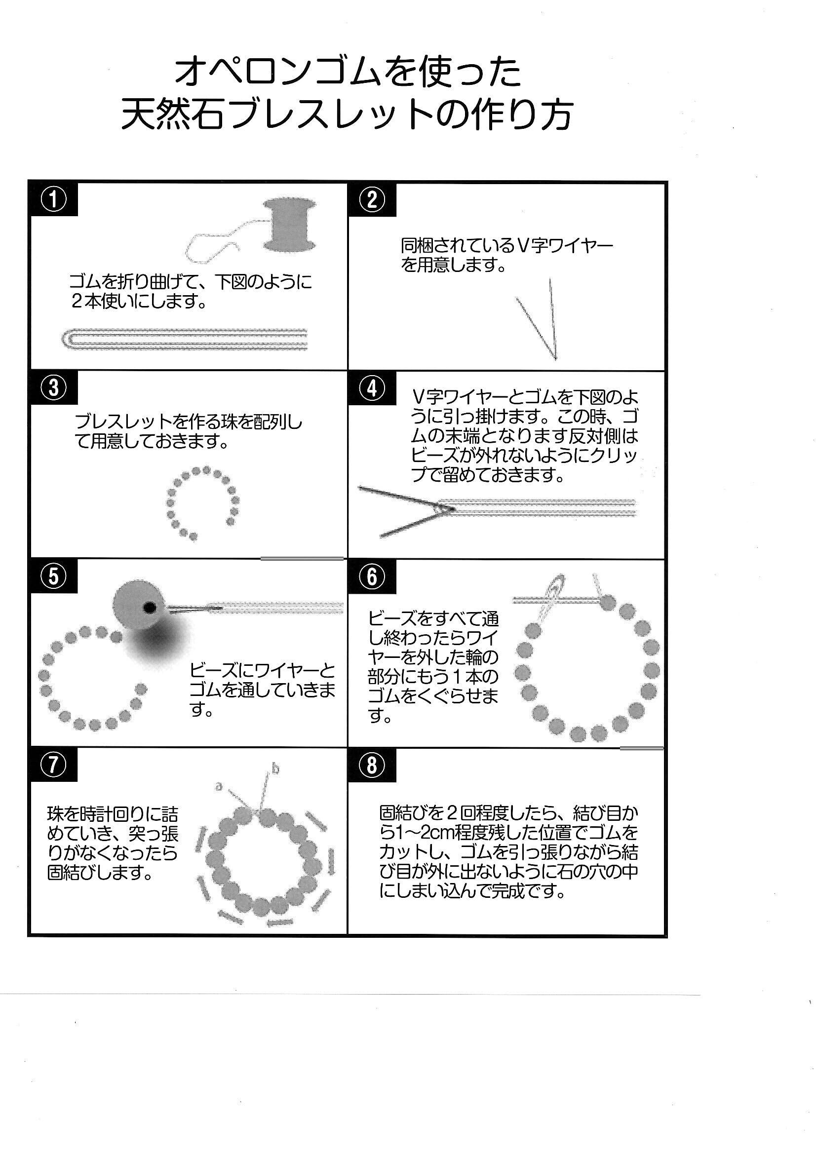 【ブレスレット修理、作成の必需品です】◆ビーズブレスレットの修理や作成に打ってつけ、白色のオペロンゴムとビーズ通しワイヤー2本、石留クリップ、図解説明書の作成セットです。