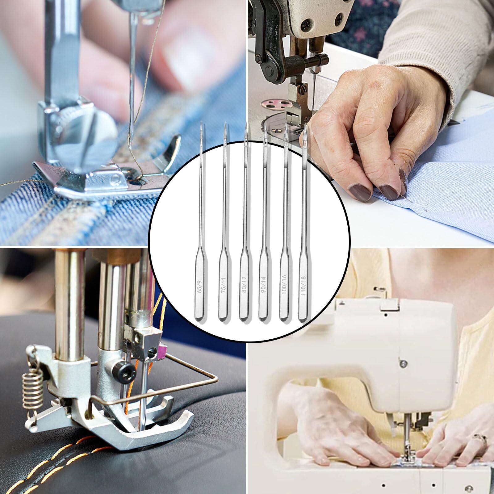 【主な用途】6種類のサイズのミシン針があり、衣服を縫う際にさまざまな生地に応じて交換できます。 #9-ガーゼやローンなどの薄手の生地に適しています、#11-綿や麻などの一般的な生地に適しています、#12-Tシャツやセーターなどの一般的な生地に適しています、#14-中厚手の生地に適していますデニムやコーデュロイなど、#16-キャンバス、厚物毛織物などに適しています。#18-非常に厚い革生地に適しています。