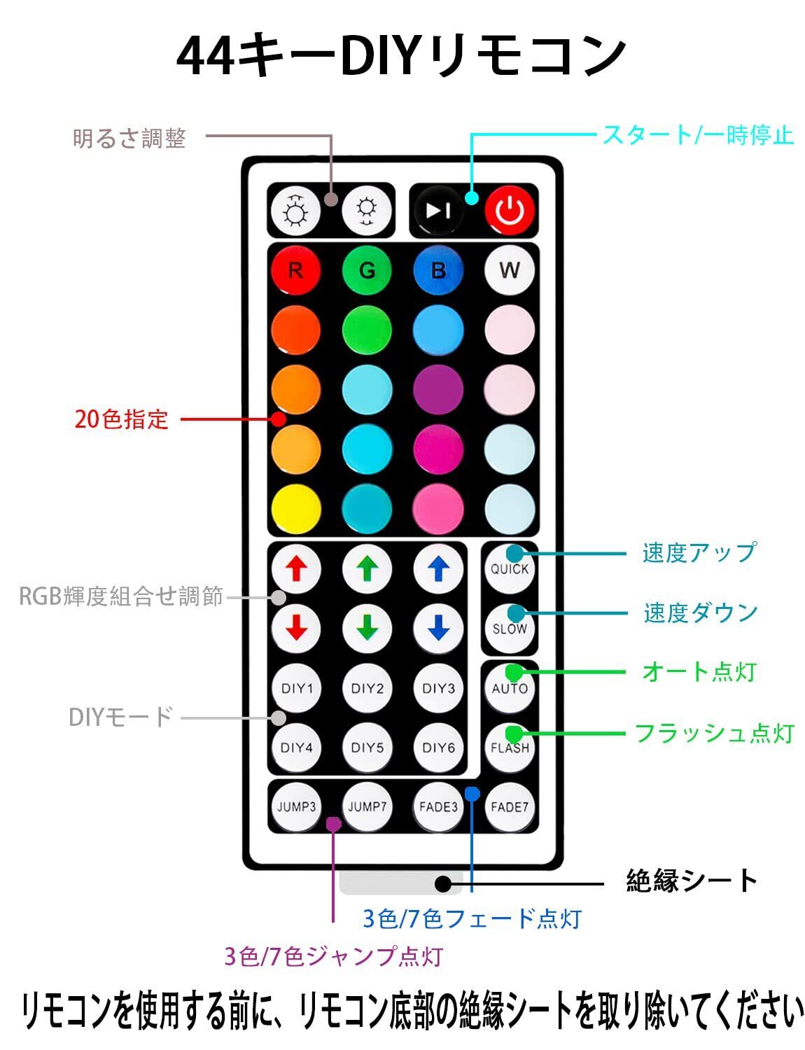 【夢のような視覚空間を作り出します】RGBテープライトは通常のレッド、グリーン、ブルー、ホワイト含めて他色20種類のほか、6DIY色、6種類の点滅モードを備え自在に調整が可能です。専用の44キーコントローラーで、それぞれのカラーLEDの明るさと点滅スピードを制御することができます。