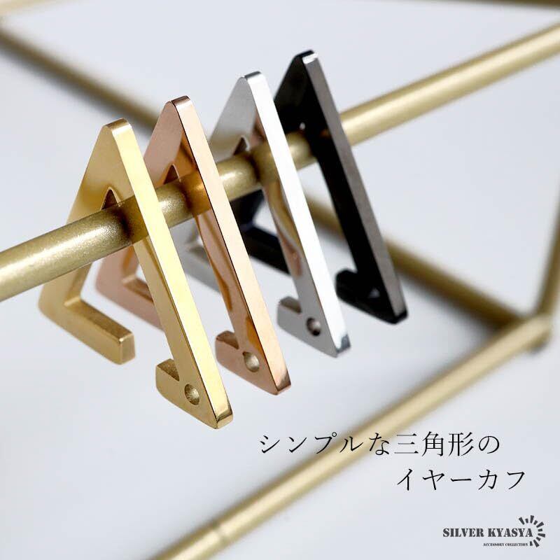 三角形のシンプルなイヤーカフ。メタルな質感とエッジの鋭いシャープな見た目が洗練された印象を与えます。ファッションのアクセントに最適なアイテムです。