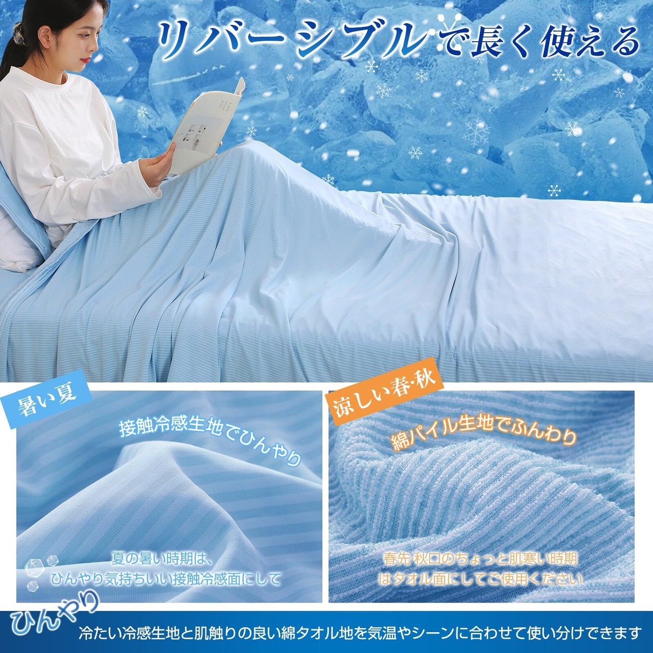 【バーシブル仕様 接触冷感&綿タオル地】表地にはひんやり心地よい接触冷感素材を使用して、肌触りが柔らかいです。裏地は吸湿性に優れた綿タオル地を使用しています。暑い時期は接触冷感生地で、つるっとひんやり涼しく。冷房の効いた部屋ではより冷たく感じられます。少し肌寒い時期はさらりとした肌触りの良い綿パイル生地でほんのあたたかくです。パイル生地は吸汗性に優れており、汗をかいてもしっかりと吸い取ってくれます。しっかり縫製で丁率な仕上げ、両面生地の滑りを防ぐことができます。
