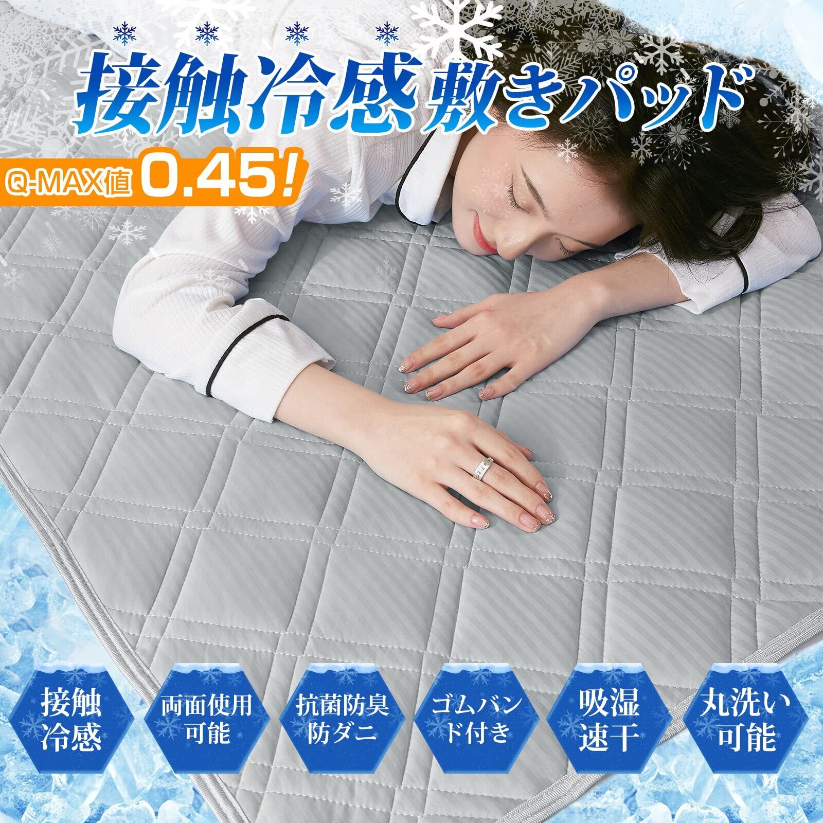 【超冷感持続・Q-MAX値は0.45】暑さで寝苦しくなる夏の時期におすすめの接触冷感敷きパッド。熱伝導により触れた部分がひんやり感じる接触冷感素材です。表地はQ-MAX値0.45のコンタクトクール生地を使用しており、肌に触れるとすぐに涼しくなり、夏でも快適に使用できる。冷房なしの時にすごく役立ち、エコで快適な睡眠をゲット!冷房や扇風機などと一緒に使用してひんやり感がアップし、超おすすめですので、ぜひ試してみてください。