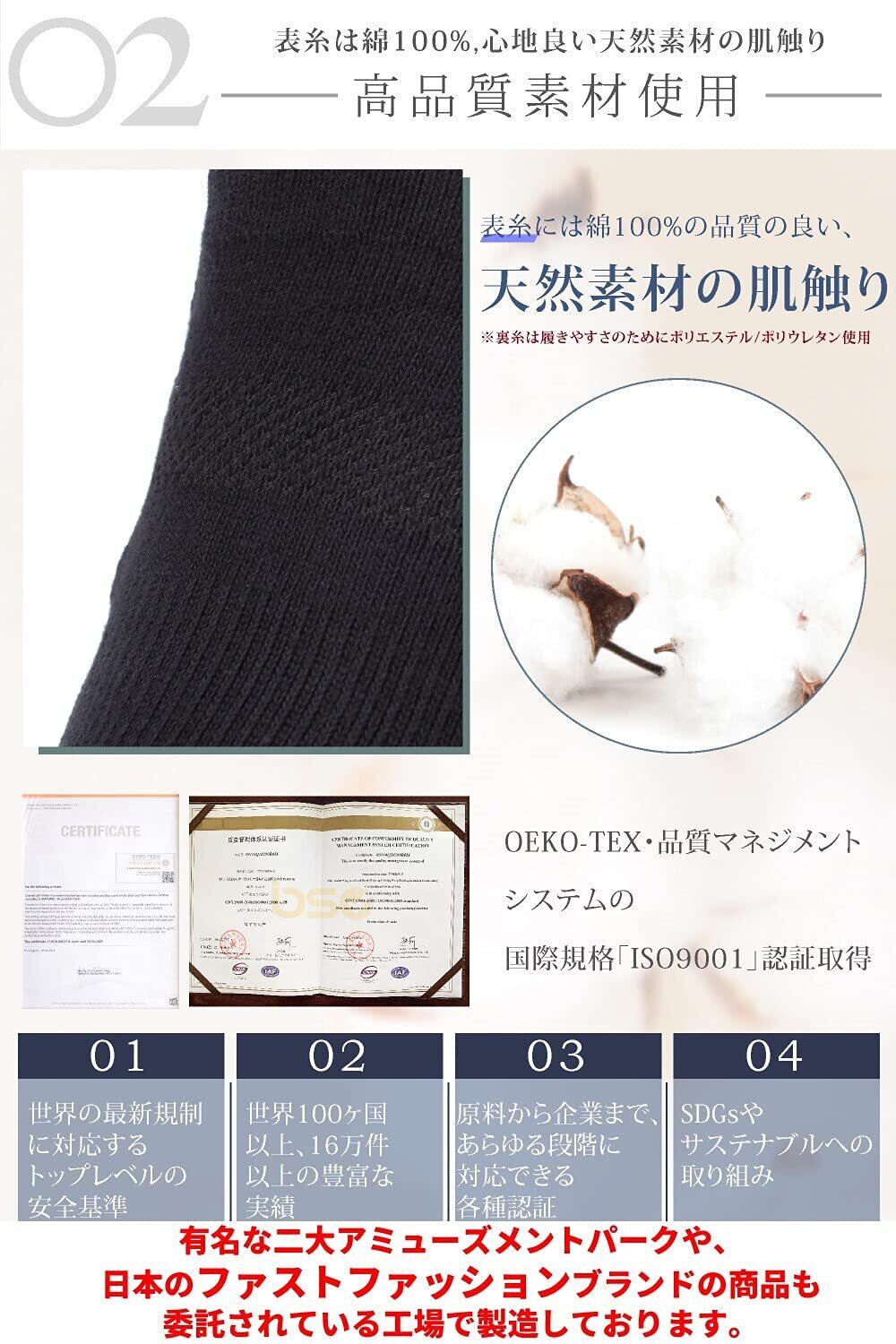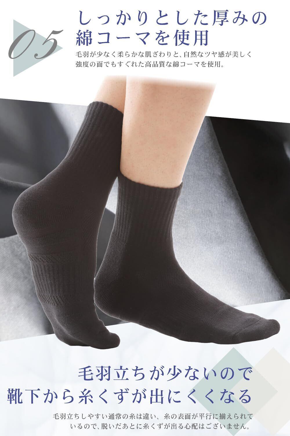 【しっかりとした厚みの綿コーマを使用】綿コーマを使用することで、短繊維や不純物を取り除き、素材の強度向上、滑らかでつやが出る、毛羽立ちが少なくなる、履いた際の靴下から出る糸くずも少なくなるなど様々なメリットがあります