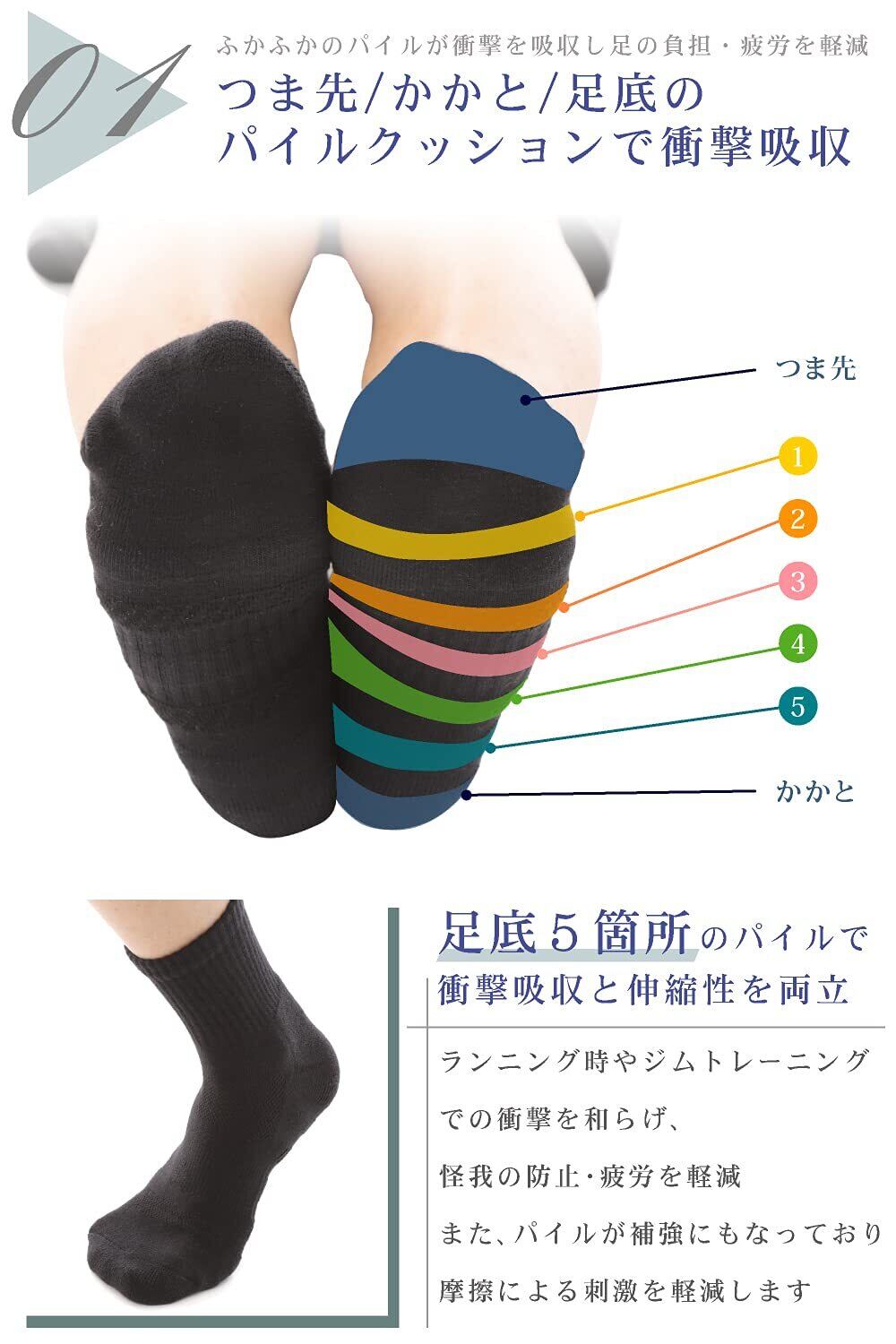【つま先/かかと/足底のパイルクッションで衝撃吸収】ふかふかのパイルが衝撃を吸収し足の負担・疲労を軽減