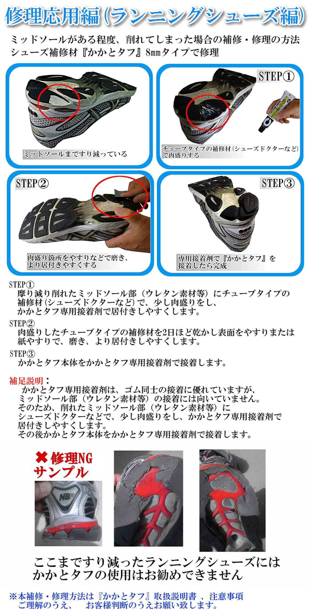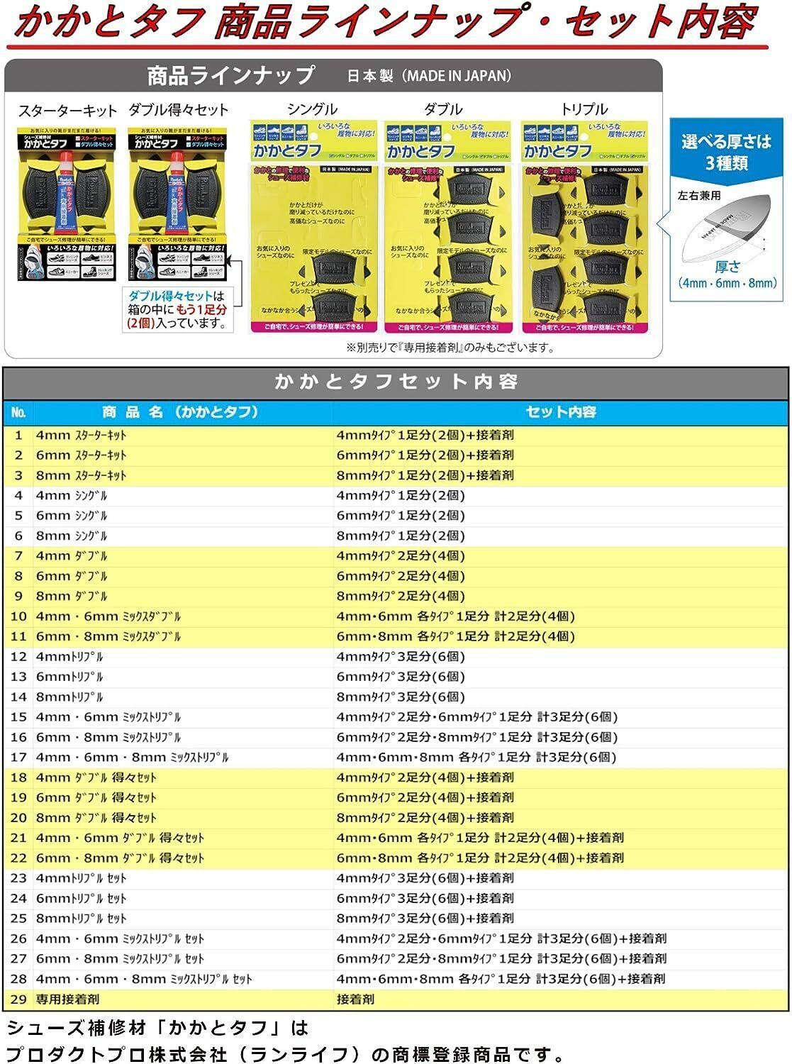 【かかとタフのゴムの厚みが6mmタイプのもの2足分(4個入り)のセットになります。】 ※本セットには「かかとタフ専用接着剤」は付属されておりません。「かかとタフ」の接着には別売りの「かかとタフ専用接着剤」をお勧めします。 また本セットとは別に「かかとタフ専用接着剤」が付属されたスターターキットや得々セットの商品もございます。 詳しくは商品ラインナップ・価格表をご参考ください。