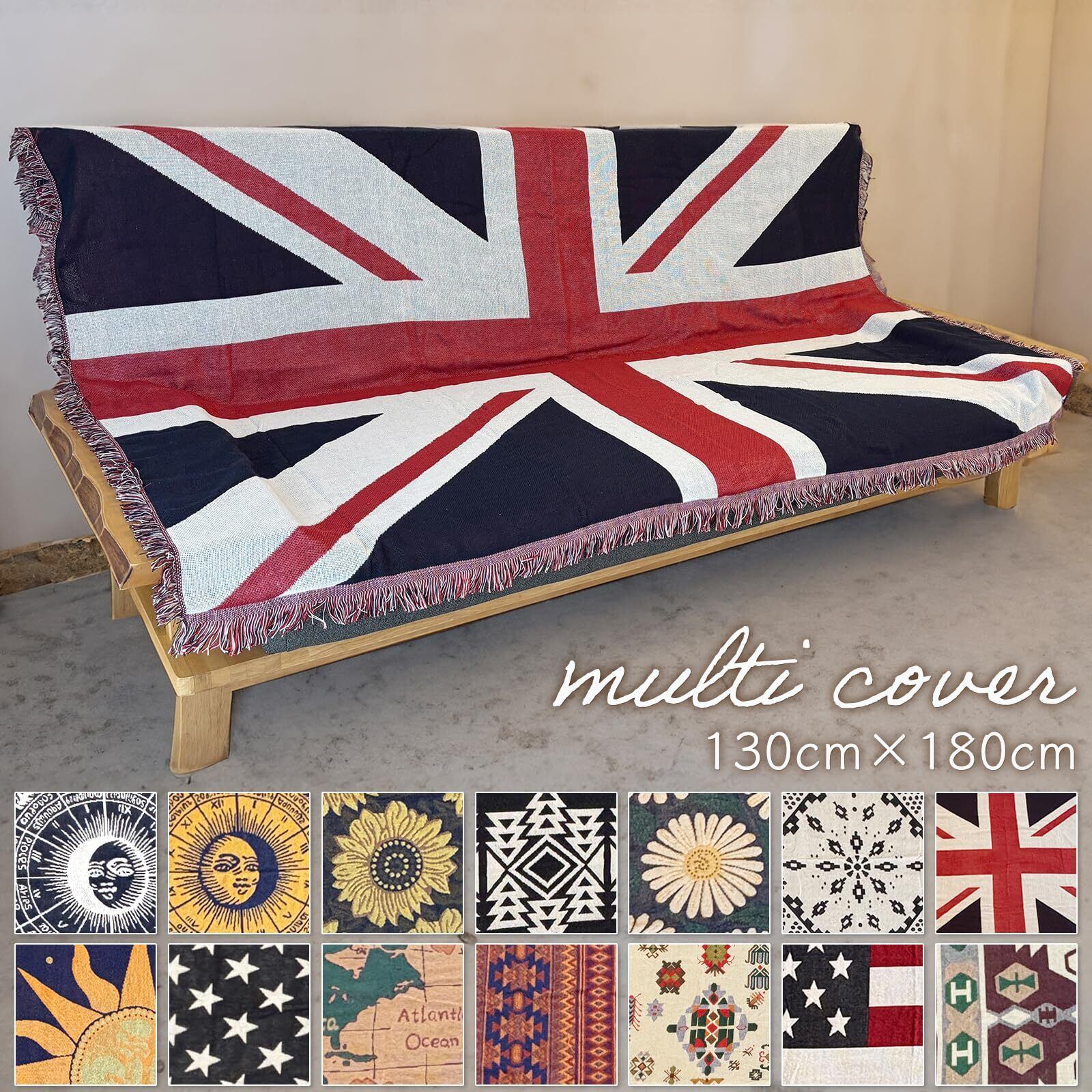 北欧デザインのマルチカバーは、太陽柄、星条旗、星座模様など多彩なバリエーションを揃えています。お部屋の雰囲気を変えるアイテムとして最適で、シンプルなインテリアにも馴染みます。サイズは130×180cmで、ソファーカバーやベッドカバー、こたつ掛けカバーなど幅広い用途に対応します。
