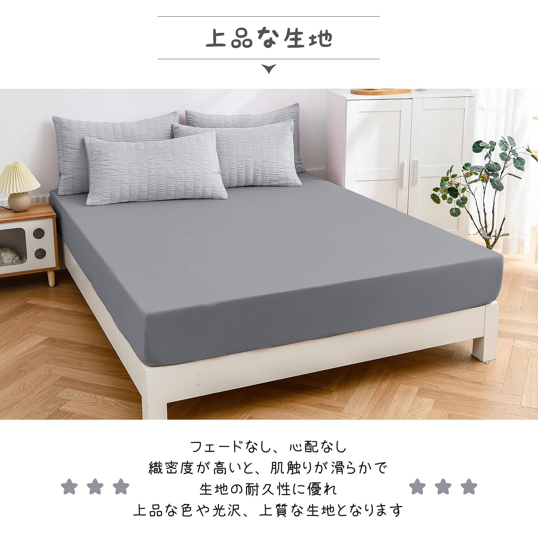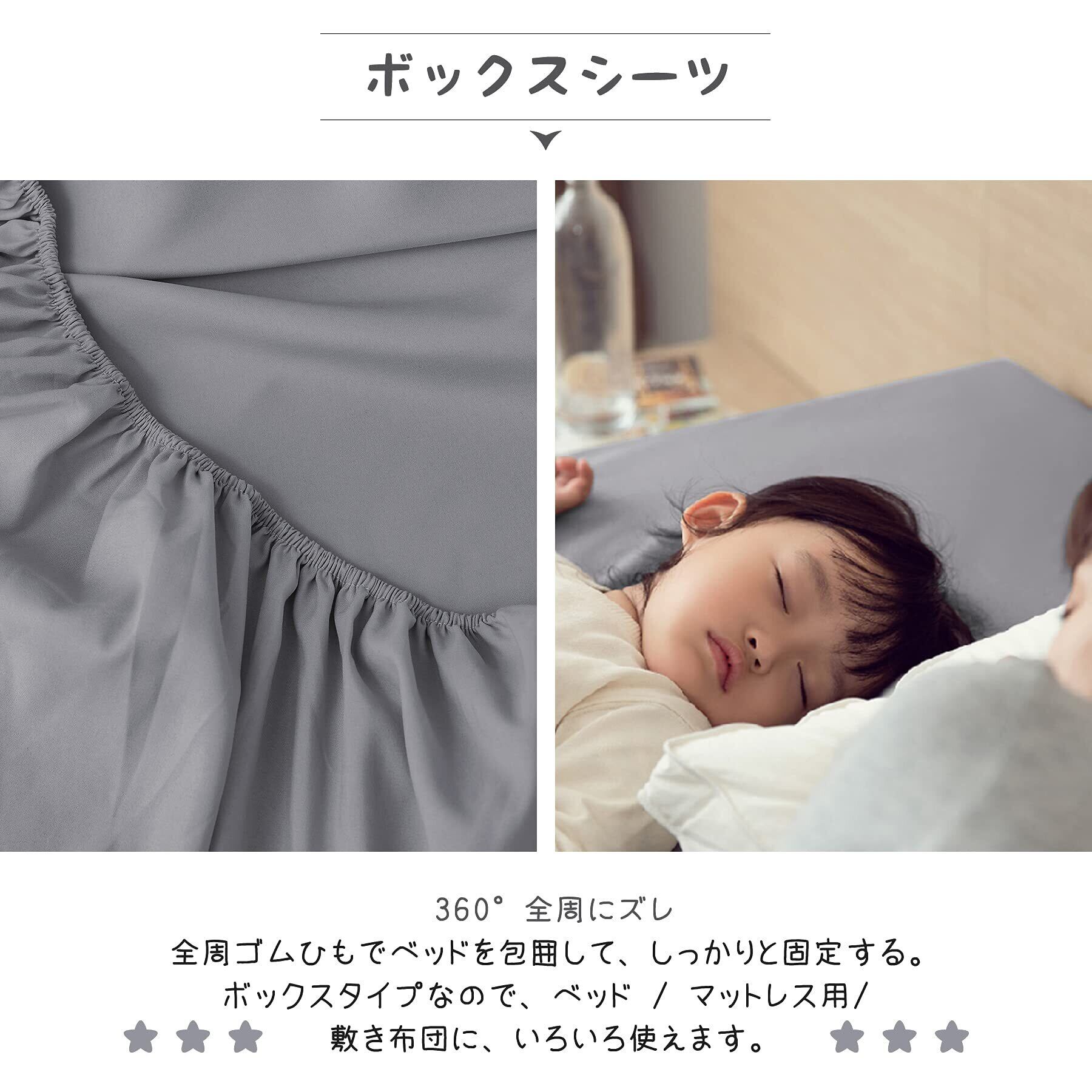 <セット内容と仕様>:「掛け布団カバー(1枚)」:片側にファスナー使用 / 布団留めひも6ヶ所付き ・ 「ボックスシーツ(1枚)」:全周ズレ防止ゴム付き / 通常サイズより大きめなので、高さ3-28cmの敷き布団とマットレスの底まで包む可能 ・ 「枕カバー(2枚)」:43X63cm(標準サイズ対応)合わせ式で、出し入れが簡単。サイズ詳細等の測り方はスタッフ間で統一、徹底はしておりますが、若干の誤差(約2~3cm前後)がある場合がございます。