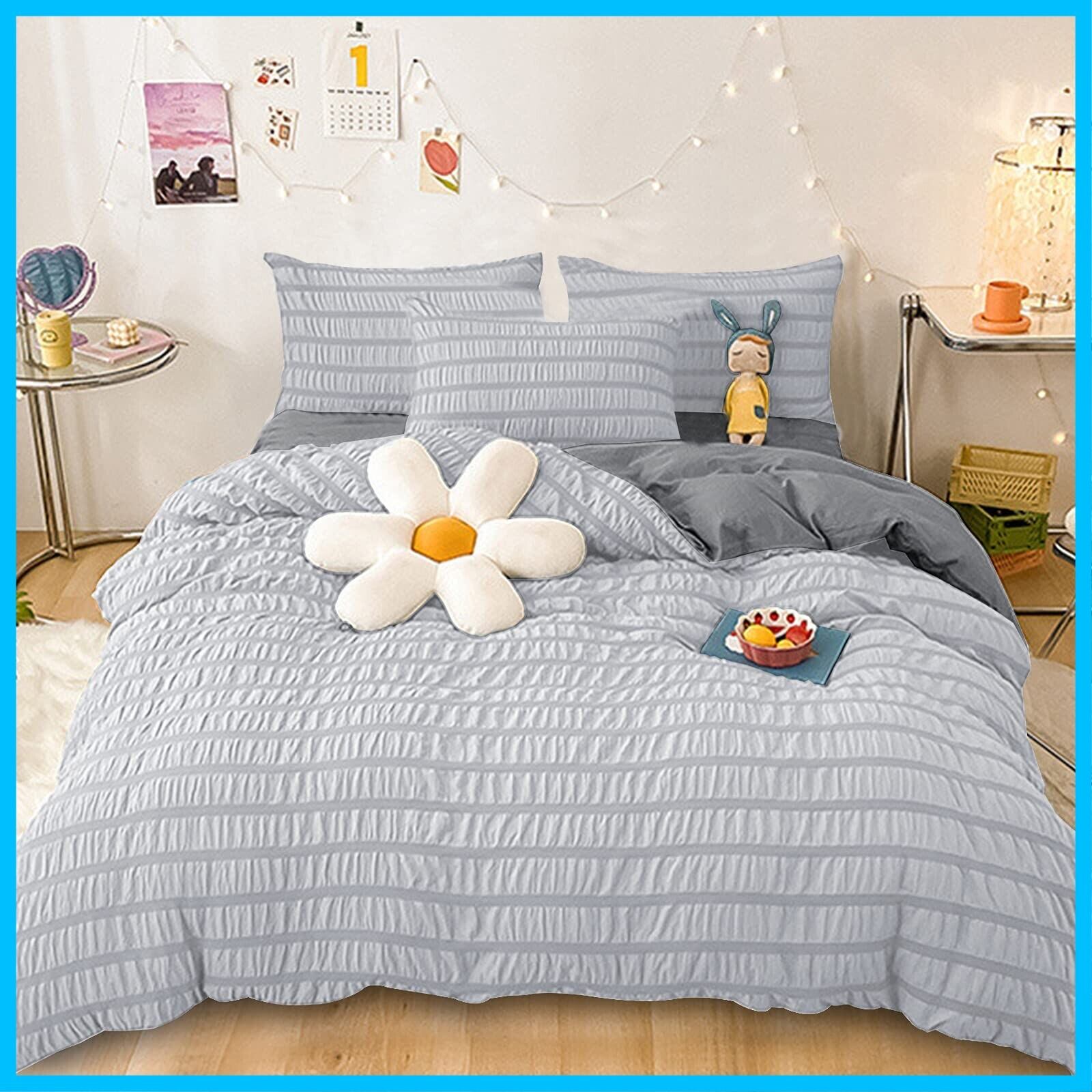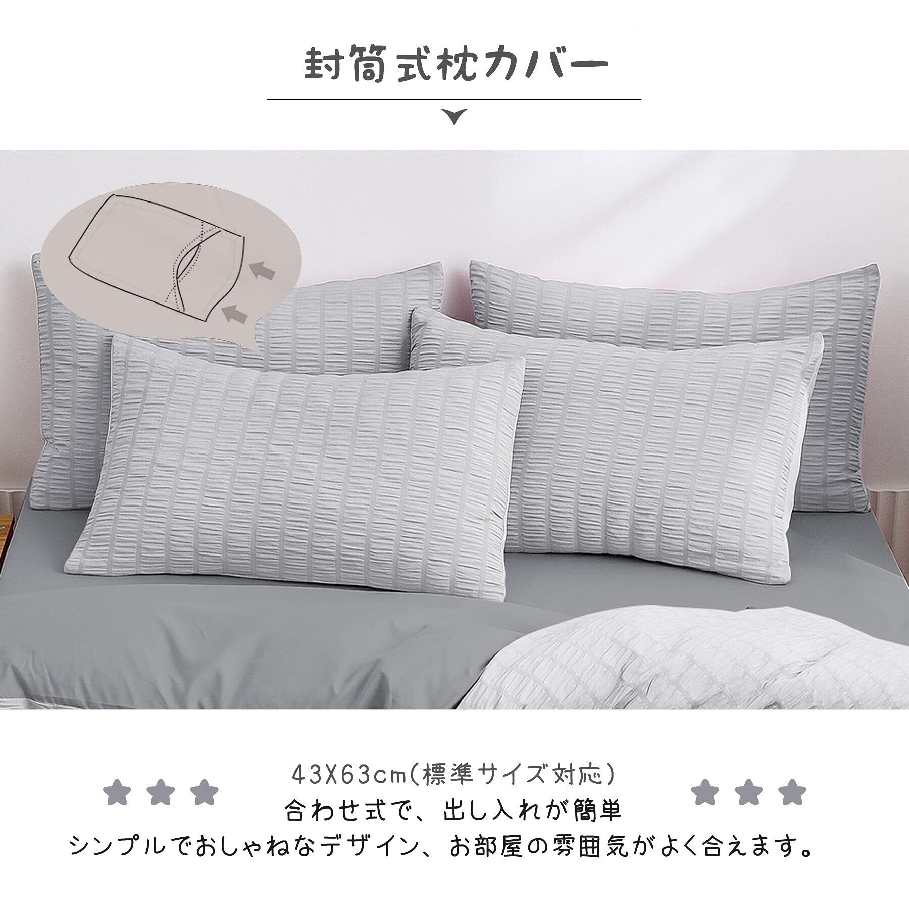 Cozyone 布団カバー 4点セット ダブル シングル シーツ シアサッカー生地 洋式・和式兼用 寝具カバーセット 掛け布団カバー ボックスシーツ 枕カバー ベッド用 布団用 優しい肌触り柔らかい 洗い替え 速乾タイプ ピーチスキン加工 四季通用 (ライトグレー+グレー, ダブル 4点セット)