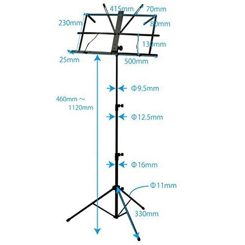 高さ:1,120~460mm(譜面部下部まで)、譜面部サイズ:500 X 230mm、折りたたんだ時の全長:530mm