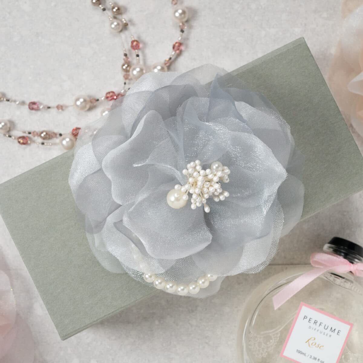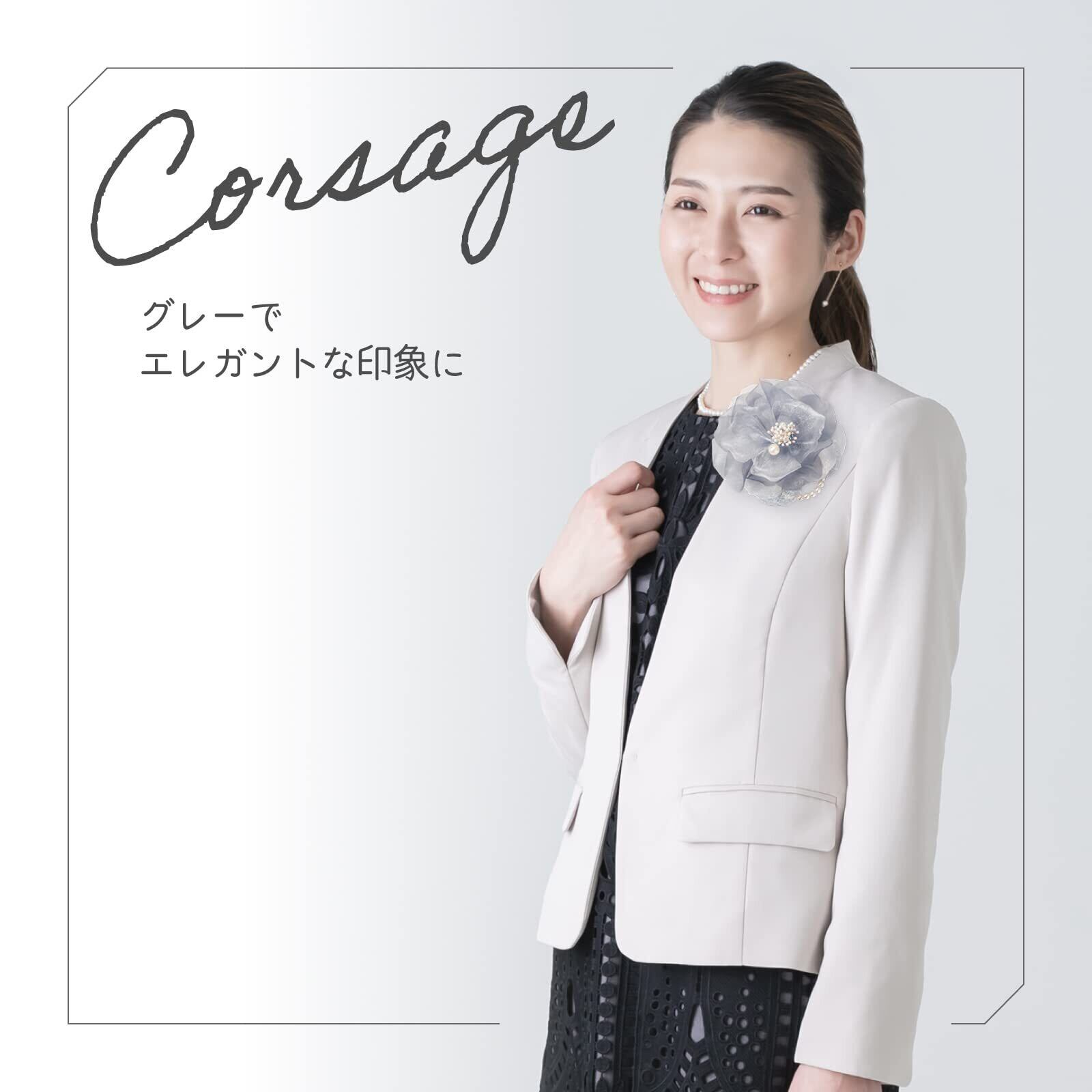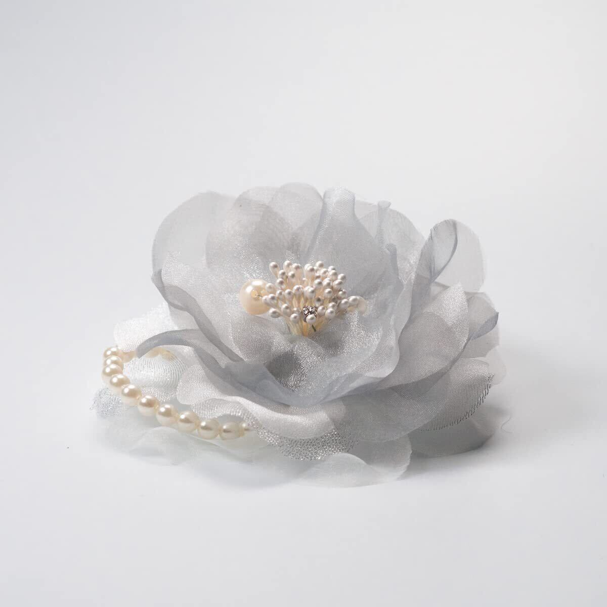 落ちついた色合いのグレーのコサージュは、大切な方へのプレゼントにもピッタリ!華やかな装いにもカジュアルな装いにも合わせやすく、卒業式、入学式、結婚式、発表会など、大切なシーンでお使いいただけます。