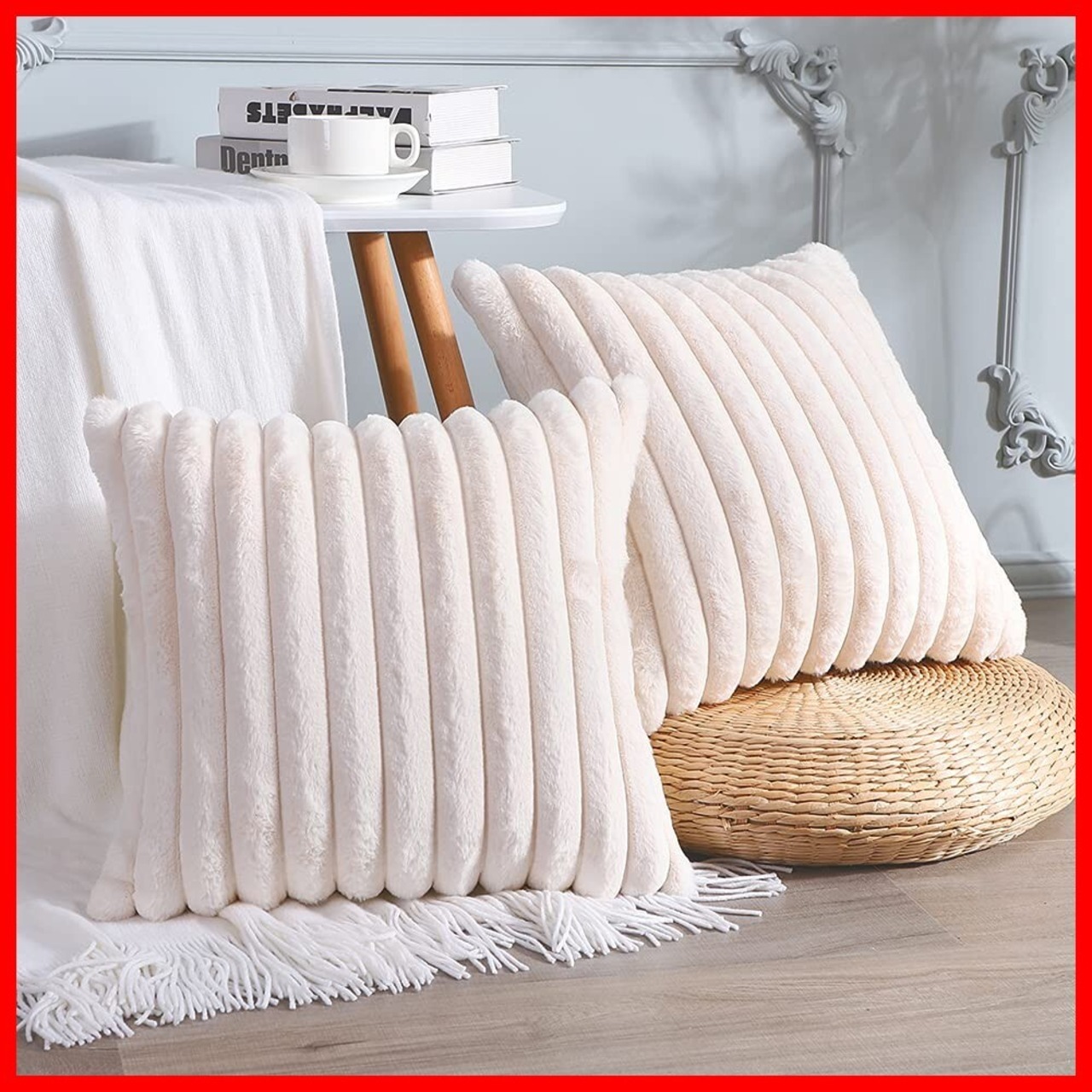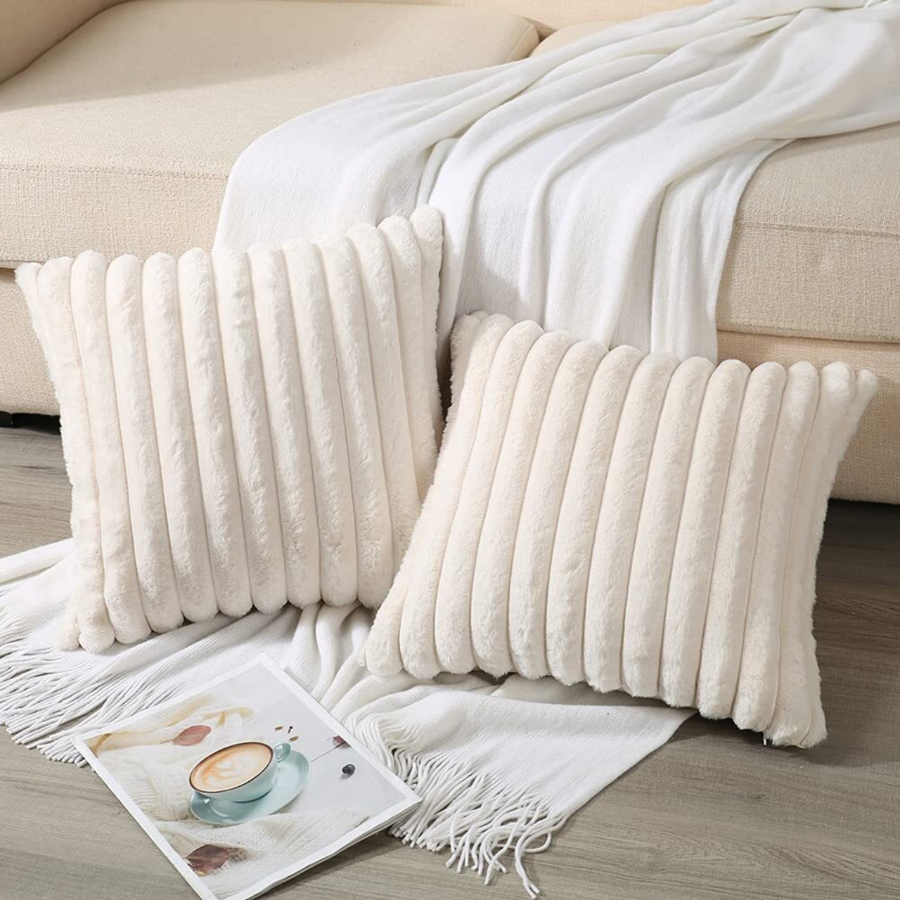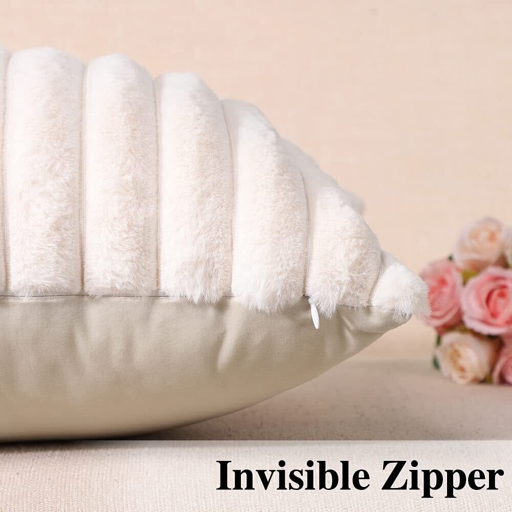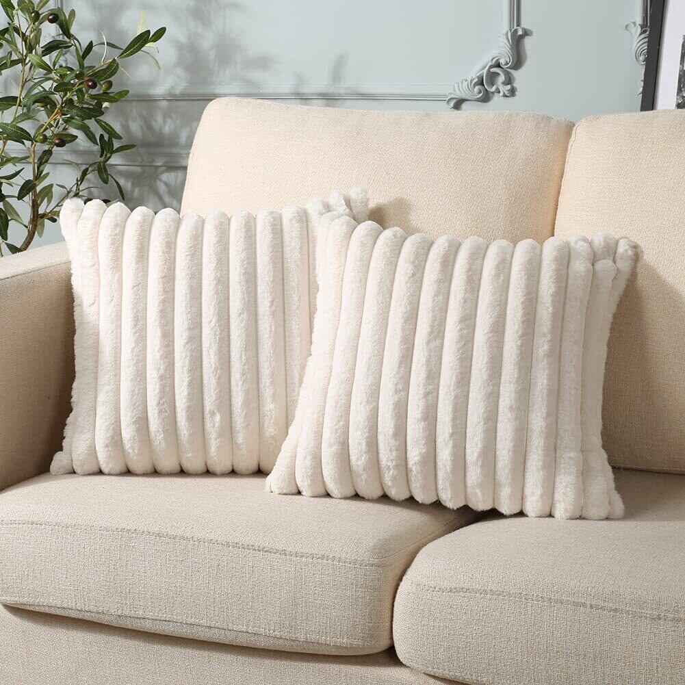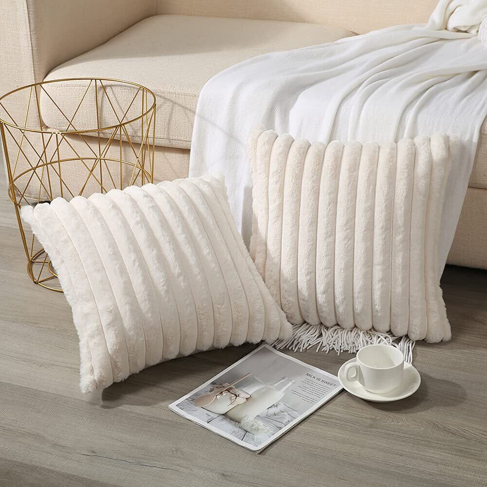 Otostar クッションカバー 60x60cm 2枚セット 北欧 おしゃれ 可愛い ファー フェイクファー ベルベット ふわふわ もふもふ 柔らかい もこもこ ストライプ 立体的 インテリア ソファー用クッションカバー ソファ背当て くっしょんかばー 装飾枕カバー 座布団カバー (60x60, オフホワイト)