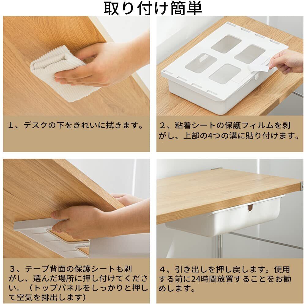【簡単に取り付け】デスクの下お手入れが簡単で、強力な粘着テープの剥離面を剥がし、設置場所に張り付けるだけの2ステップ。スライド式の収納ボックスなので、サッと取り出しができます。