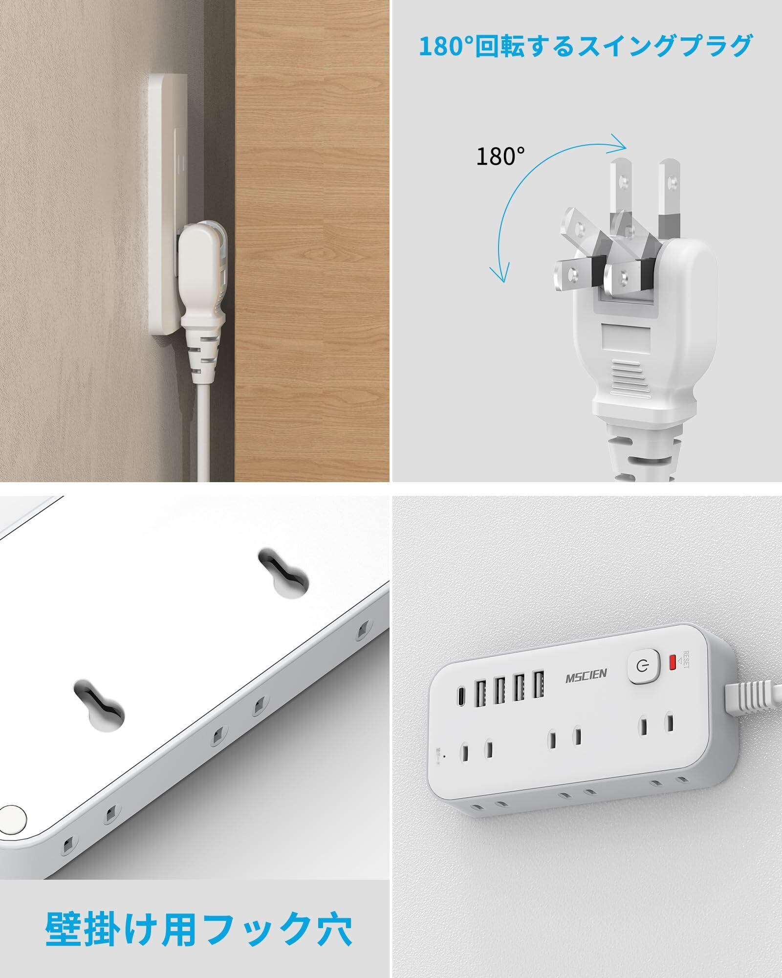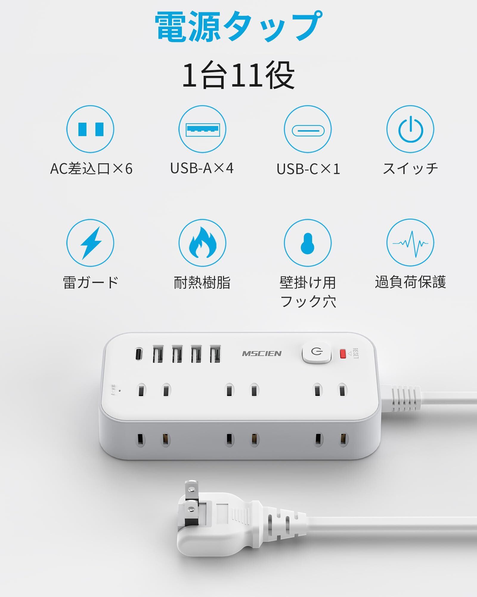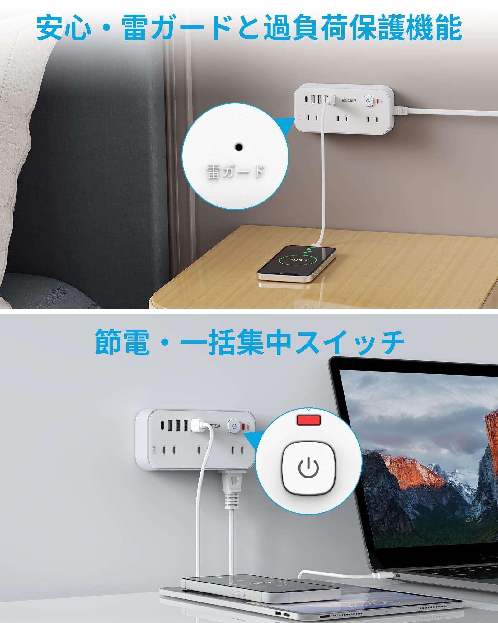 Mscien 延長コード 2m 電源タップ タコ足配線 電源コード 6個AC口 4個USB-A 1個USB-C 電源タップ usb スイッチ付き 雷ガード 横差し 蛸足コンセント タップ コンセント 分岐 たこあし oa マルチタップ 延長 コード オシャレ 壁掛け/卓上に (2M)