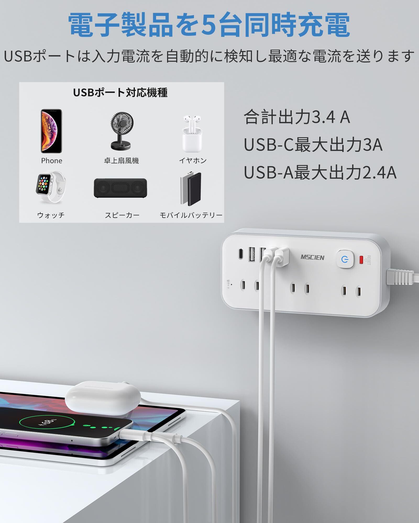 電源タップusb:テーブルタップの各USBポート合計3.4 A出力。USB-Aポートは最大5 V/2.4 A出力で、設備に最適な電流を流す。type-cポートは最大5 V/3 A出力で、充電がより便利です。