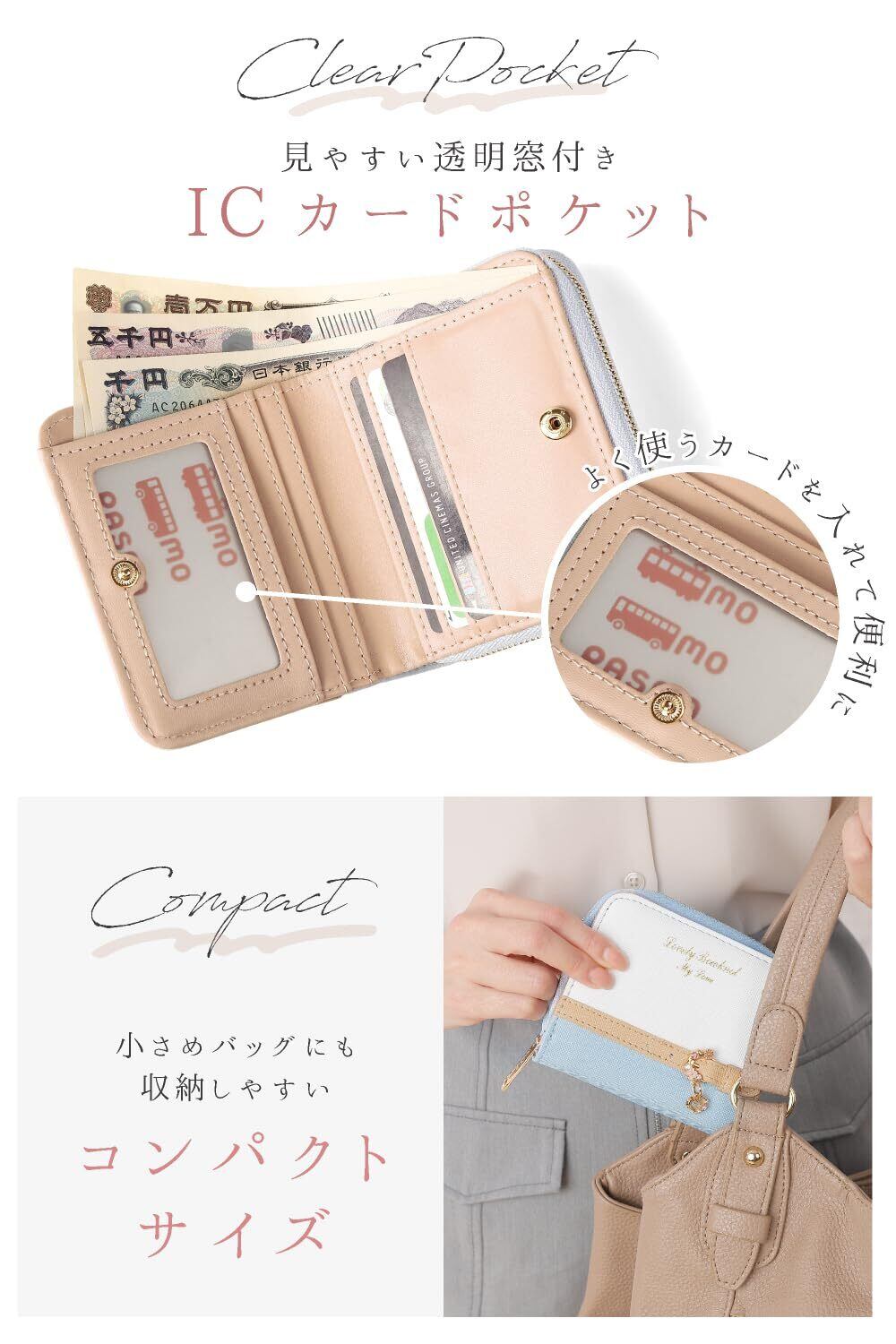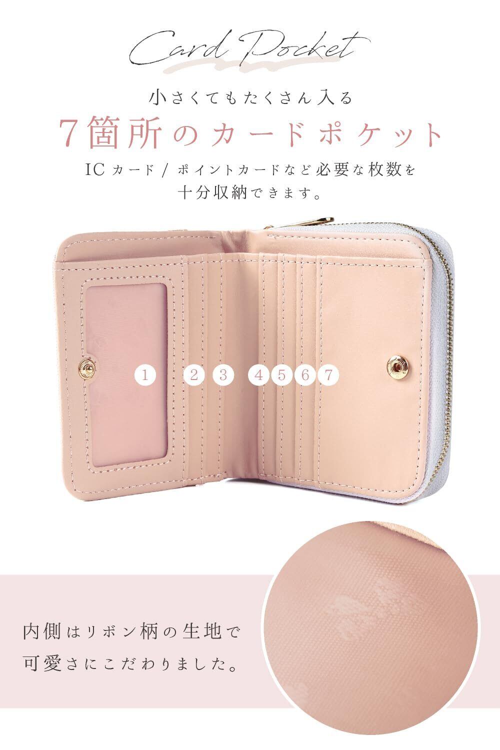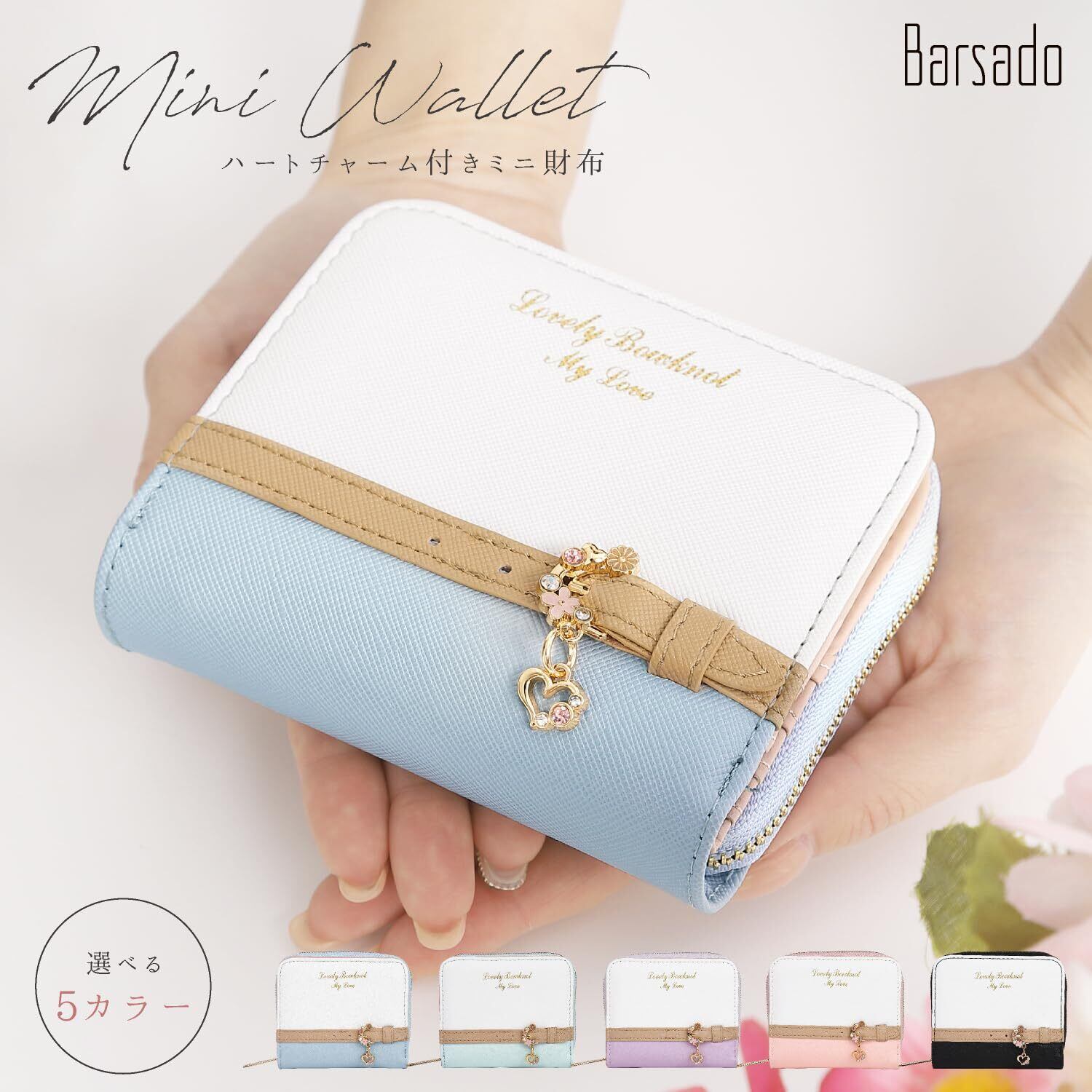 小さなカバンには小さなお財布を 上質PUレザーミニウォレット シンプルに使いやすい二つ折り財布 パステルカラーが可愛らしさを引き立てます。 1.ゴールドアクセント 美しく光り輝くゴールドカラーがアクセント&高級感をプラス 2.ハートのワンポイント ハートのワンポイントアクセサリーで可愛さを 3.上質なPUレザー 上質なPUレザーを使用。丈夫で使いやすい。 4.実用性抜群! 小銭入れ、カード入れ、窓付きカード入れもあって使いやすい設計です。