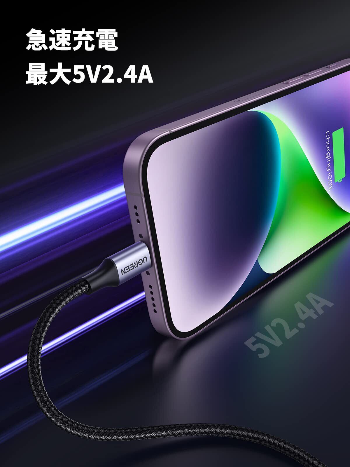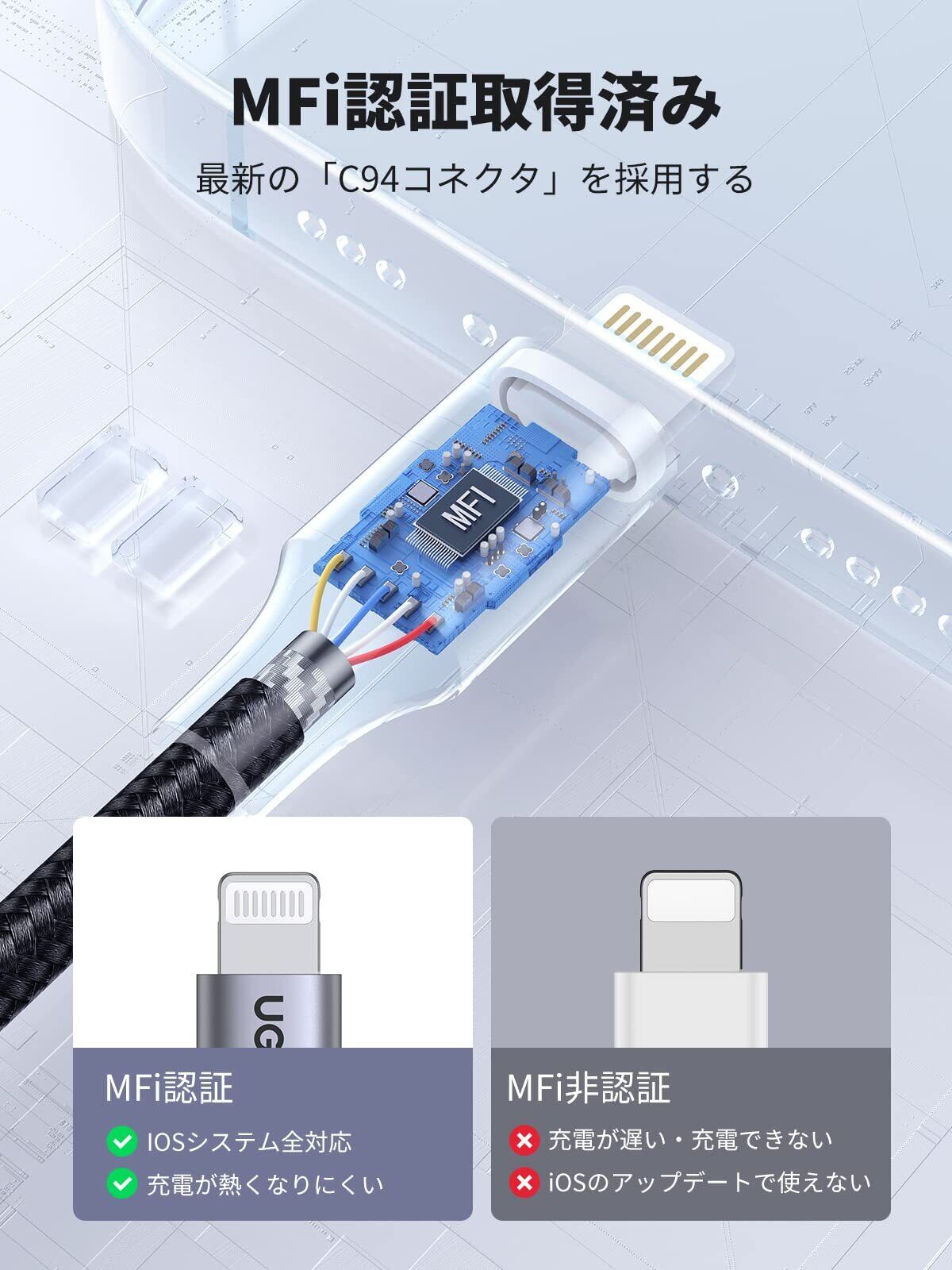 MFi 正規認証:Appleの正規ライセンス「Made for iPhone/iPad/iPod」を取得したライトニングUSBケーブルです。アイフォン純正のチップセットを採用し、お使いのiOS機種を完全に対応し、エラーのポップアップなしで、充電やデータ転送を快適に行えます。iOSアップデートでもこのLightningケーブルは完全対応できると保証できます。