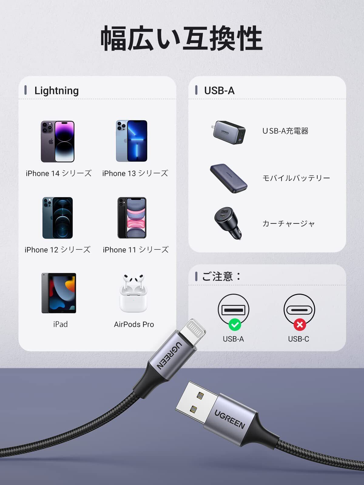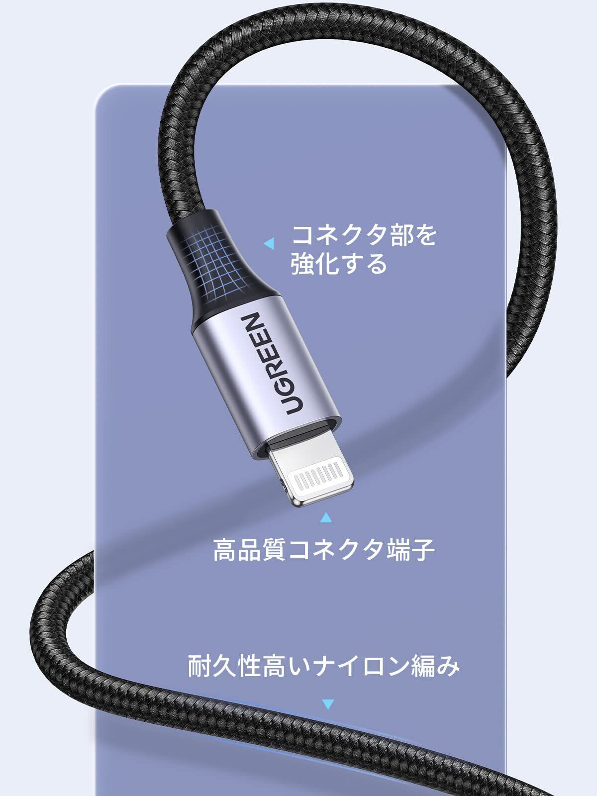 UGREEN ライトニングケーブル MFi認証 iphone充電ケーブル iPhone 14 14 Plus 14pro 14 Pro Max iPhone 13 12 11,iPad Airpods などLightning端子に対応 アイフォン 充電コード グレー 2m
