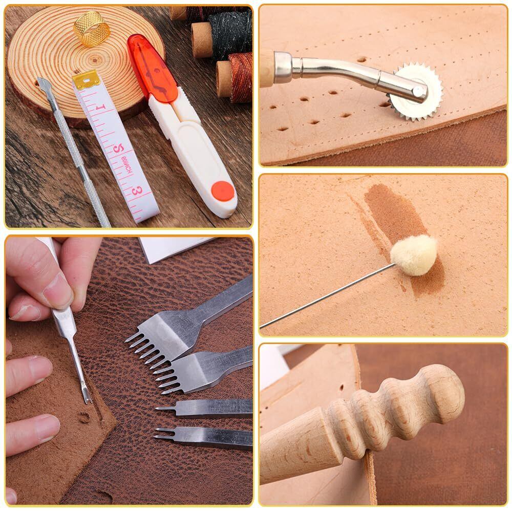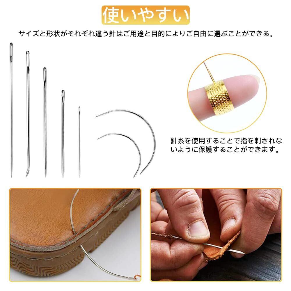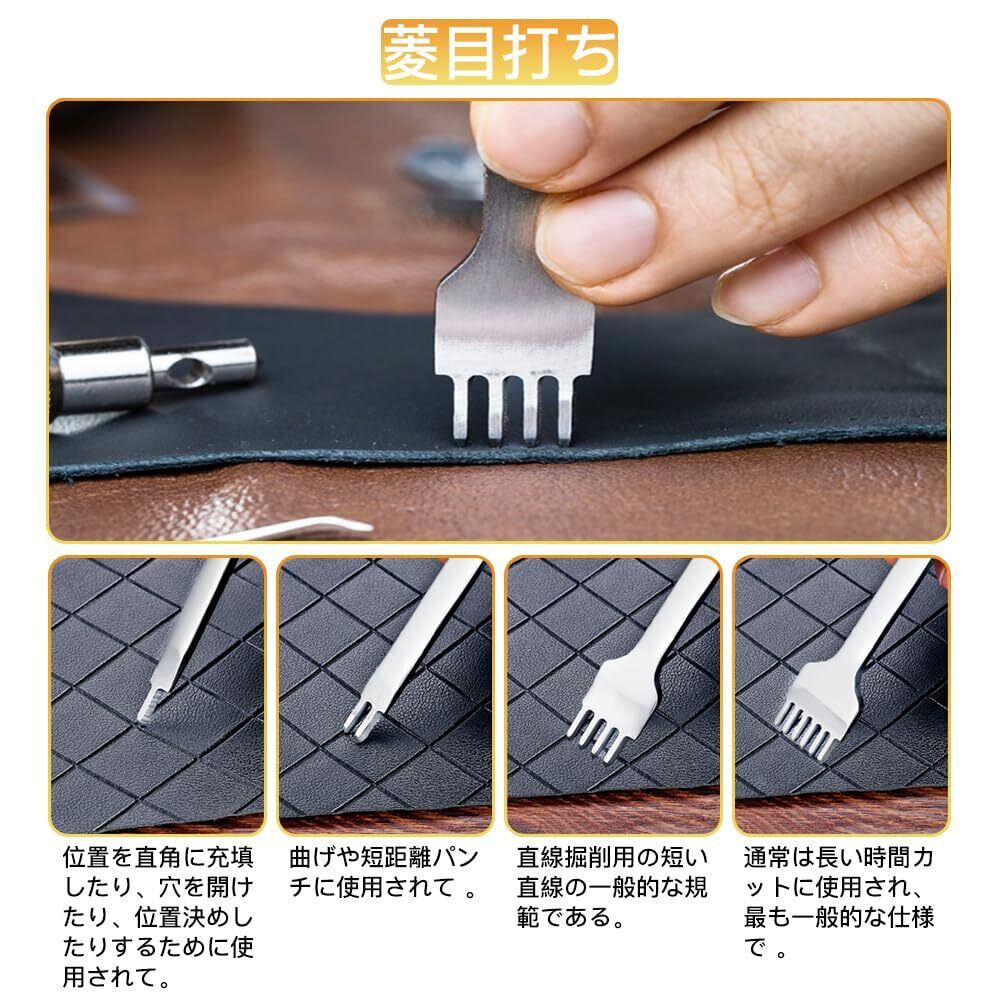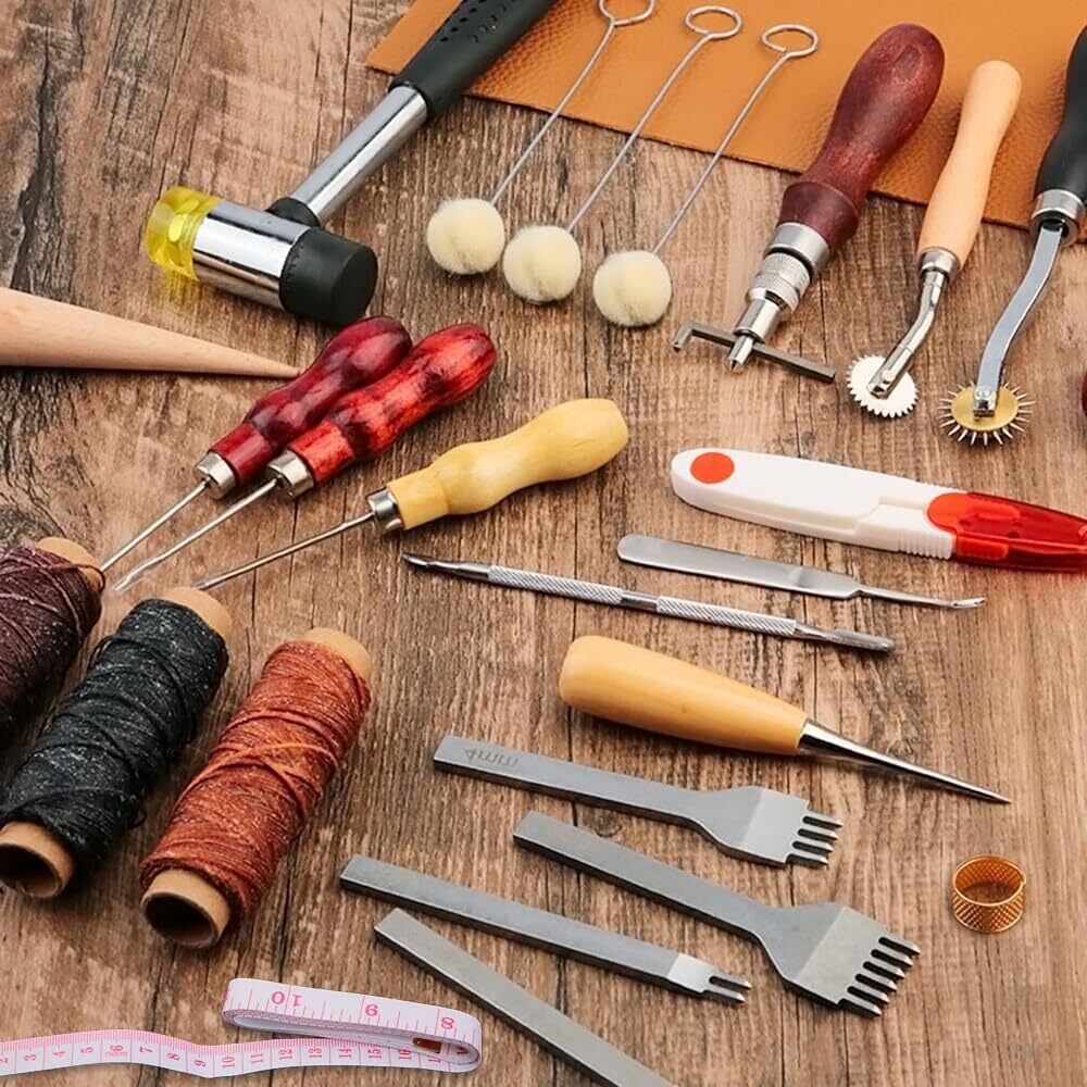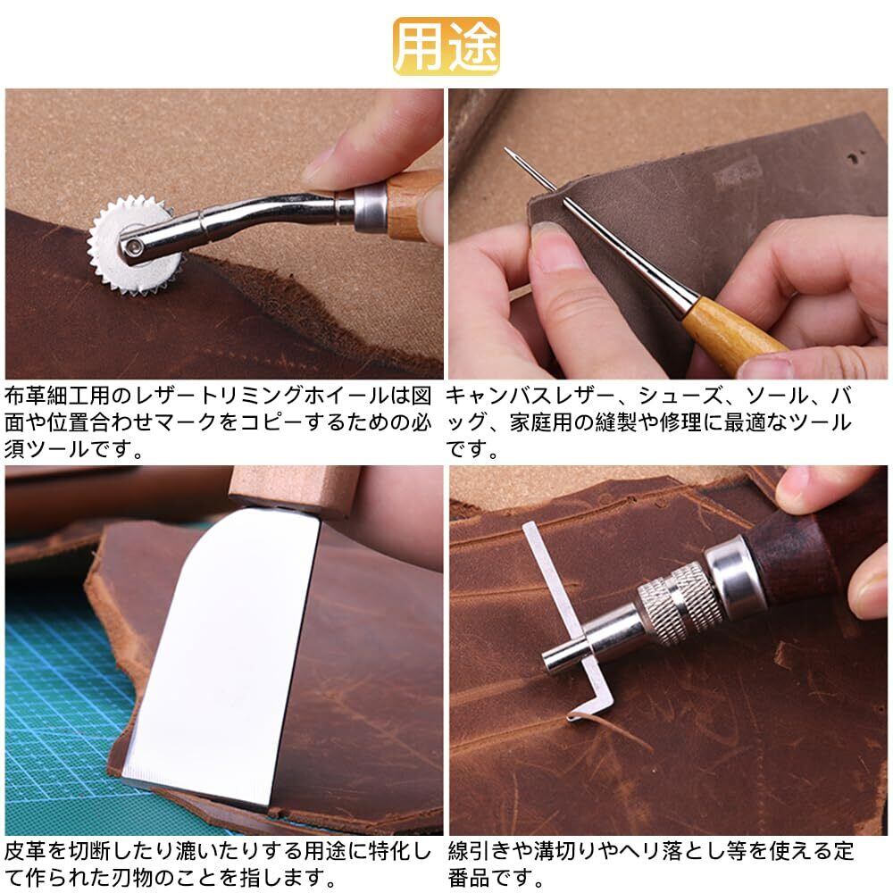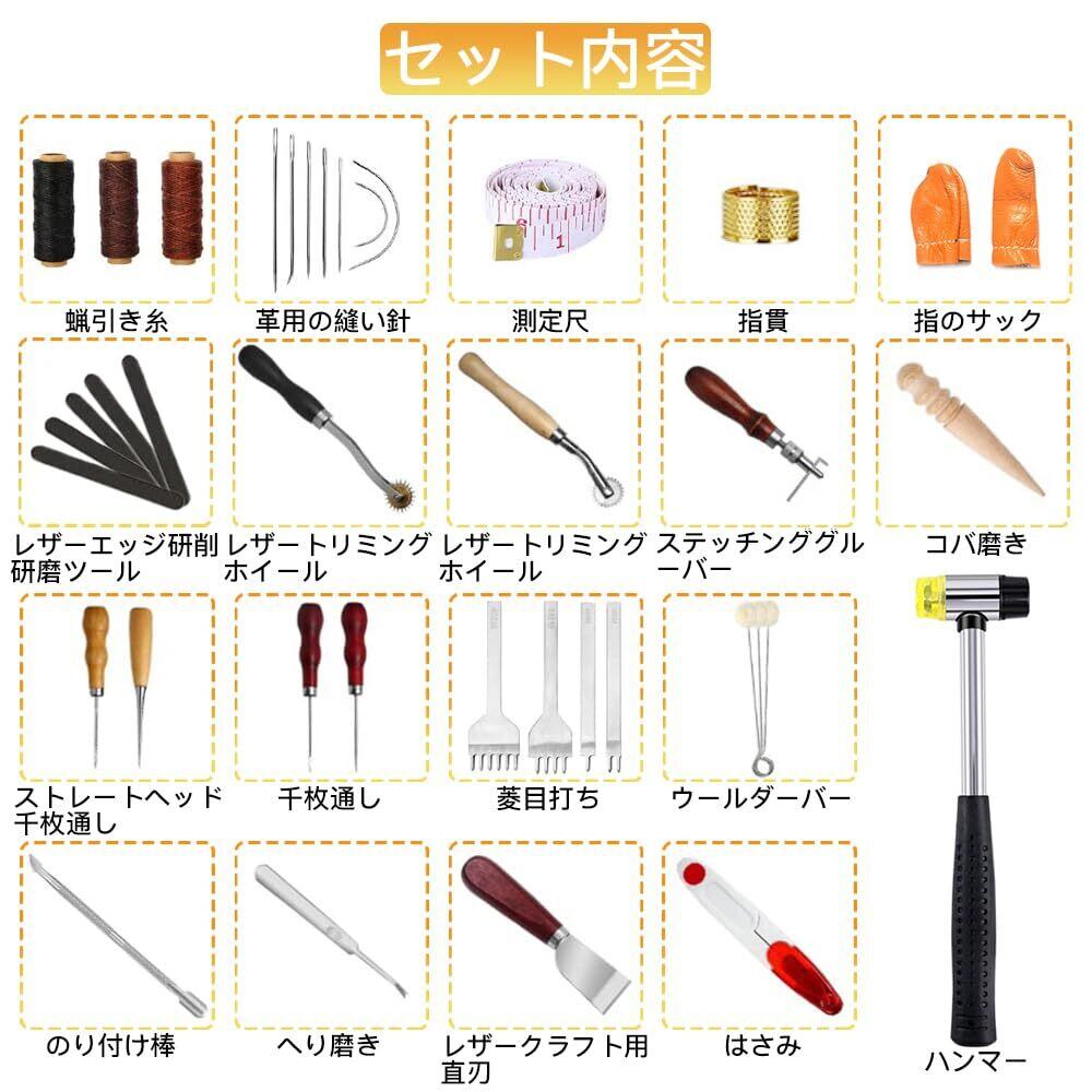 セット内容:計38個セット。指のサック*1(色はランダム)、ハンマー*1、系*3、裁縫用針*7、のり付け棒*1、へり磨き*1、ウールダーバー*3、ハサミ*1、測定尺*1(色はランダム)、指貫*1、コバ磨き*1、レザートリミングホイール*2、レザーエッジ研削研磨ツール*5、ステッチンググルーバー*1、菱目打ち*4、千枚通し*2、ストレートヘッド千枚通し*2、レザークラフト用直刃*1。
