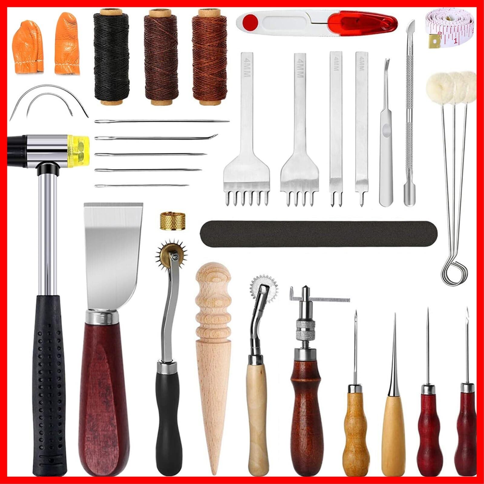 サムコス レザークラフトキット 革工具セット 初心者 練習 工具 ハンマー 千枚通 革包丁 革用針と糸 打ち具セット レザートリミングホイール 菱目打ち ハサミ 研磨 コバ磨き 測定尺 指貫 のり付け棒 DIY 手作り 手縫い (38個セット)
