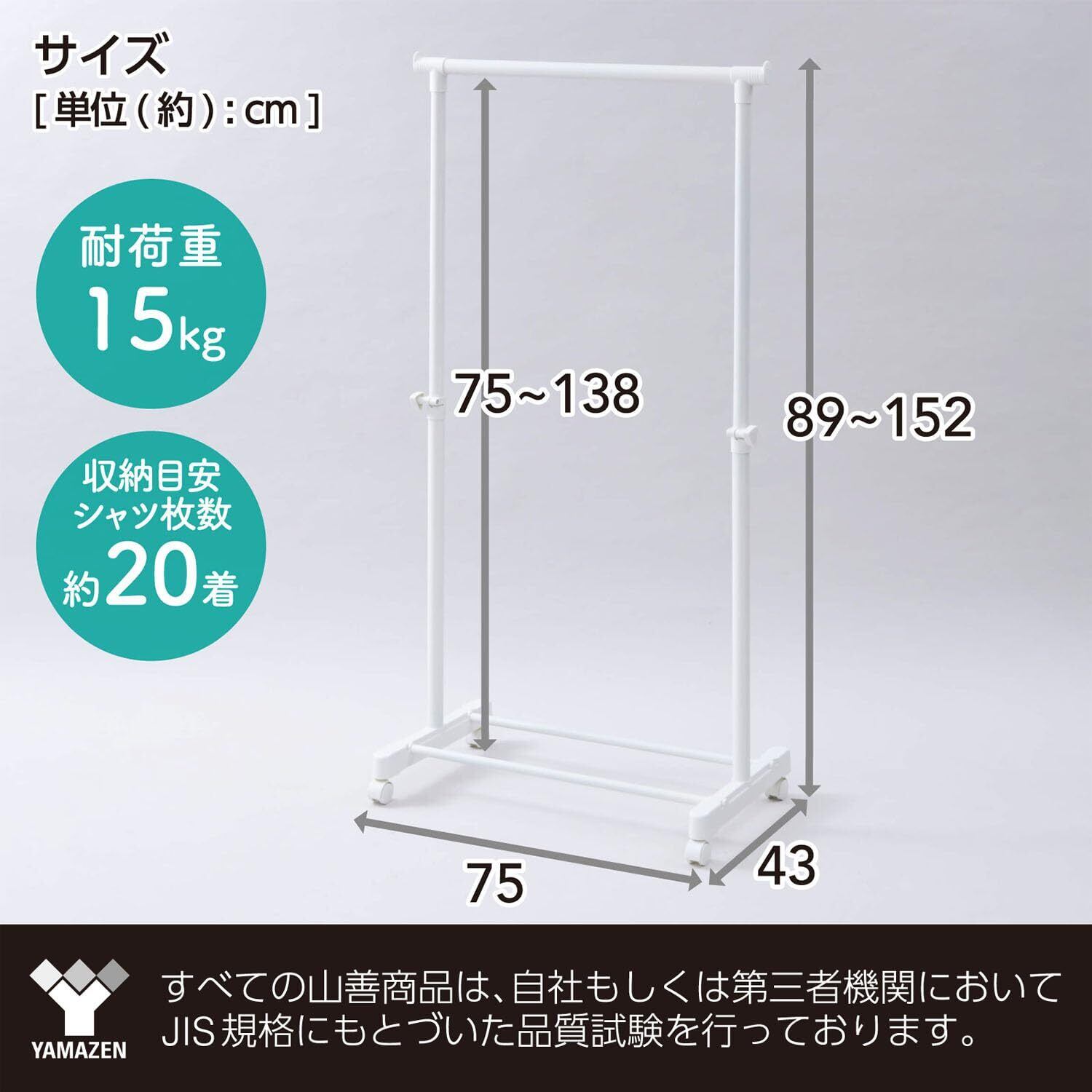 ●本体サイズ:幅75×奥行43×高さ89-152cm●ハンガーバーの下部からベース用パイプまでの距離:75-138cm●耐荷重:15kg●材質:構造部材/金属(スチール)・ポリプロピレン、表面加工/エポキシ樹脂塗装●お客様組立品(かんたん組み立て)