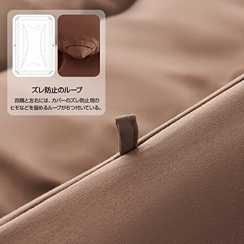 【ピーチスキン加工、やわらかくしっとり触感】肌に優しいピーチスキンの触り心地でしっとり気持ちよく、ムレにくく快適です。ほこりが出にくい、綿切れしにくい、中空ポリエステル綿を使用。ズレ防止ループ付き端の8ヶ所にズレ防止用ループが付いているので、お布団がズレる心配もありません。