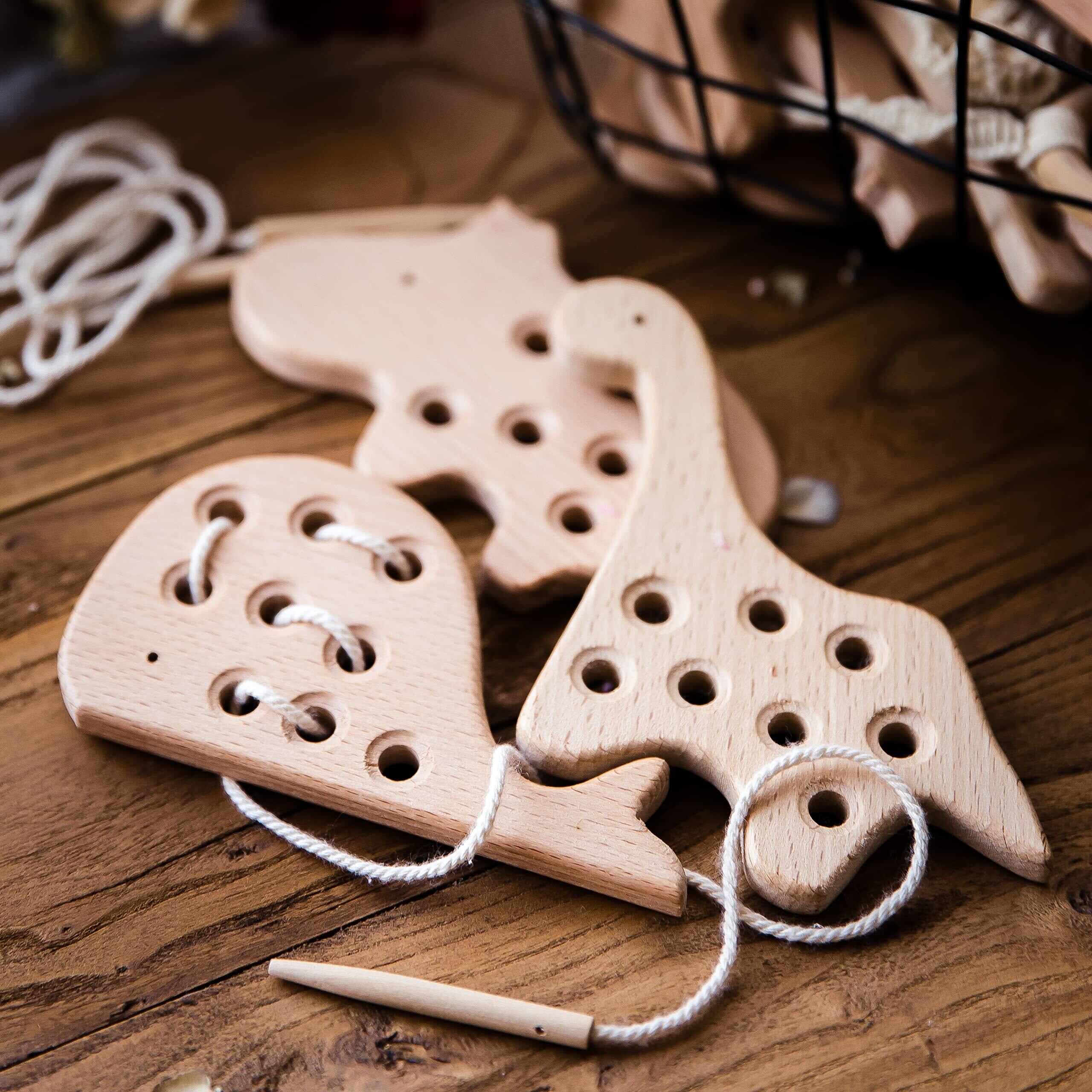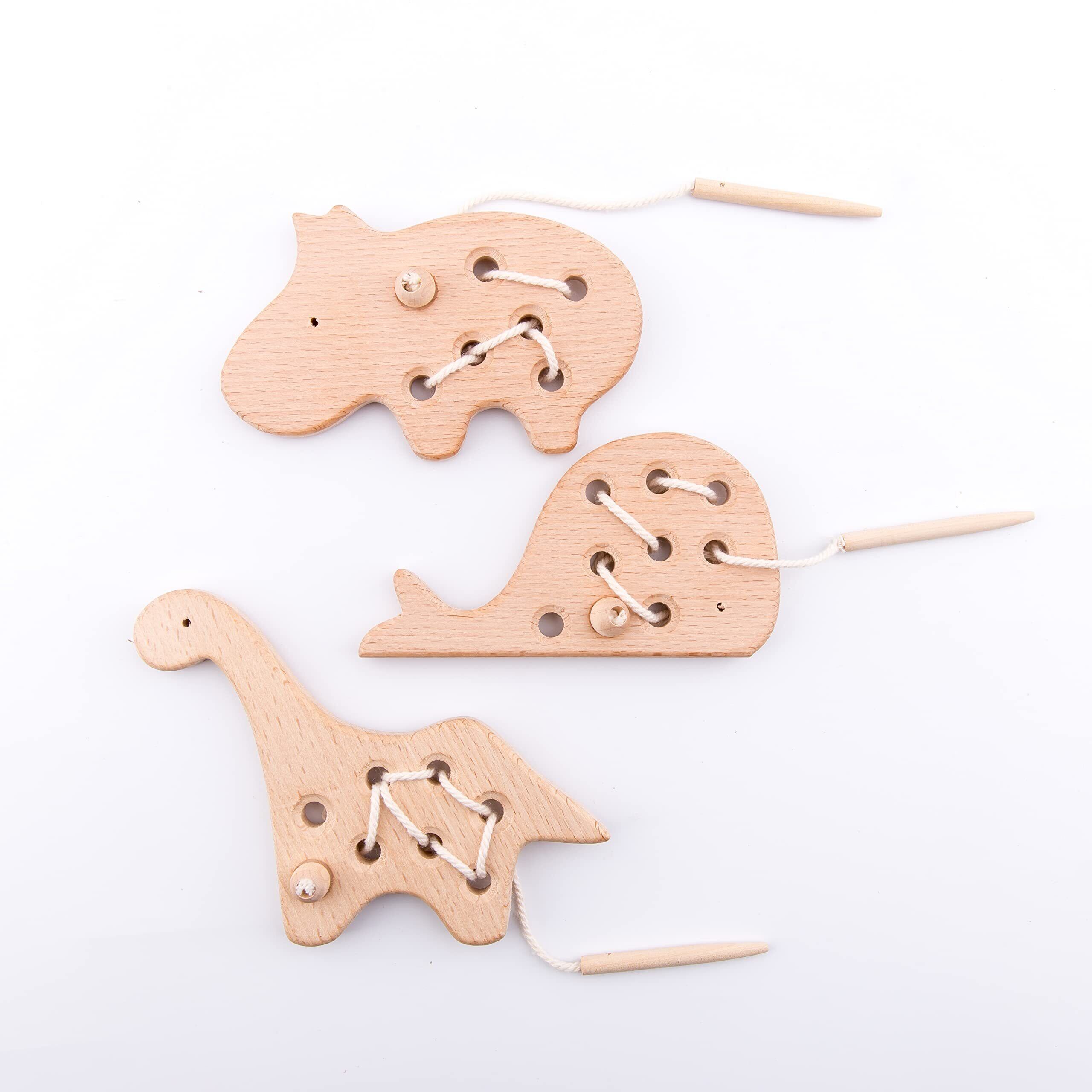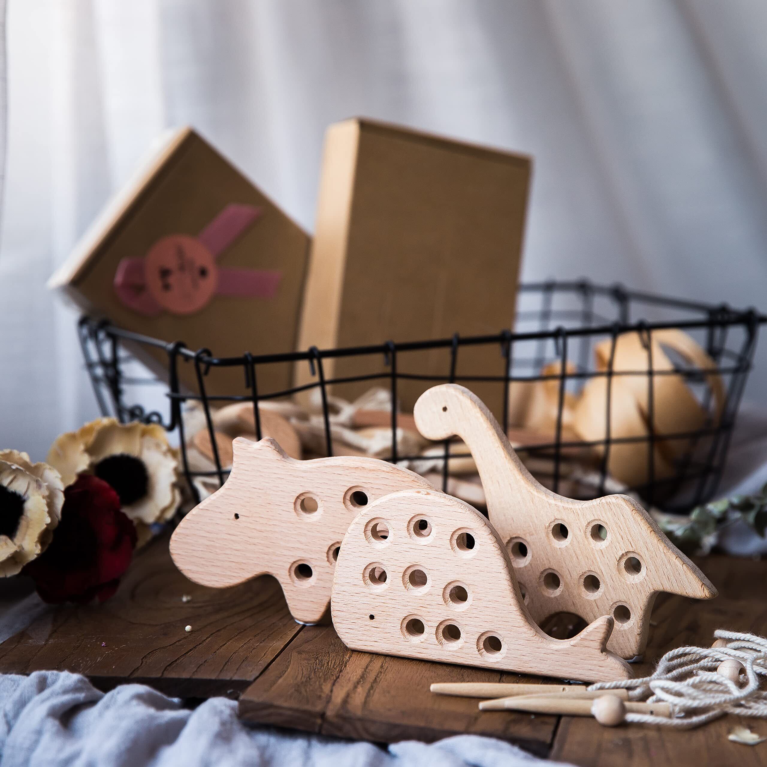 O-Life ひも通し おもちゃ 紐通し ひもとおし 赤ちゃん 知育玩具 早期開発 指先訓練 協調能力 子供向け 動物 クジラ 鯨 カバ 恐竜 ディノサウルス木製 天然木 1歳~3歳 可愛い プレゼント 出産祝い 誕生日