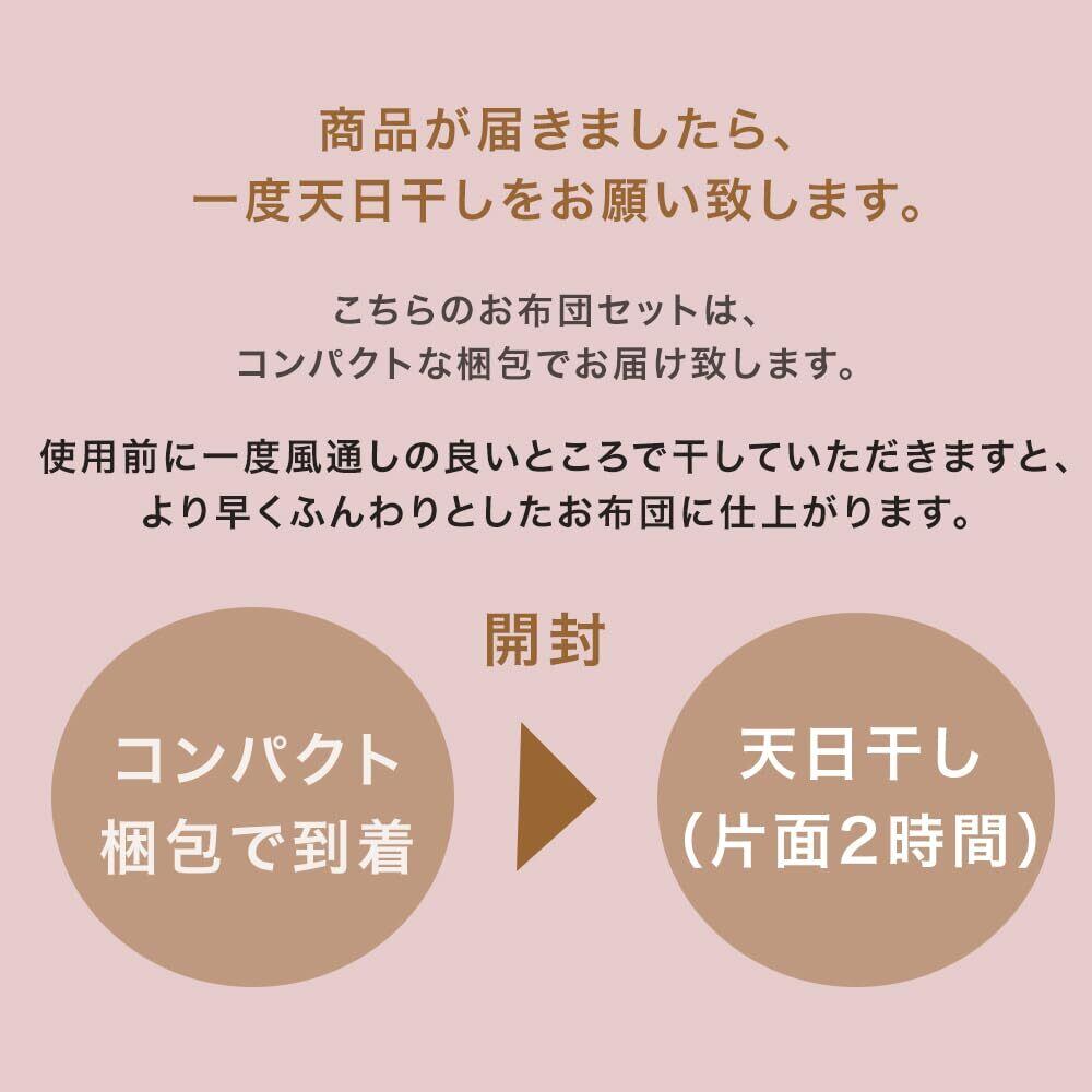 【備考】【洗濯可(敷布団除く)】 ※サイズ表記は生地寸であり、仕上がり寸ではございません。予めご了承ください。 ※こちらの布団セットは、コンパクトな梱包でお届け致します。 使用前に一度風通しの良いところで干して頂きますと、より早くふんわりしたお布団に仕上がります。