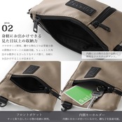 【素材】ナイロン 【収納】メイン収納、内側ファスナーポケット、外側ファスナーポケット、内側キーホルダー(Dカン)、背面クリアポケット