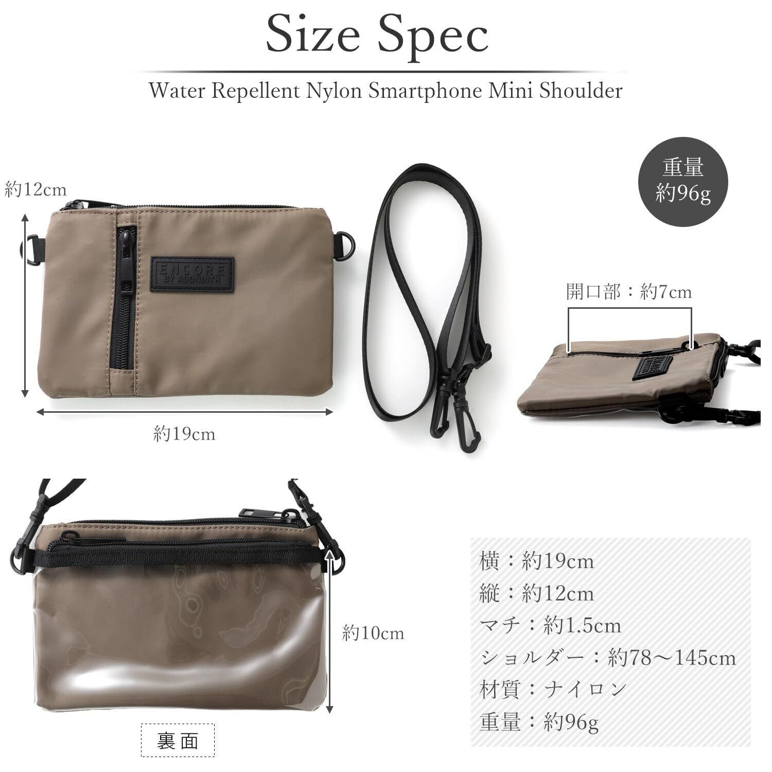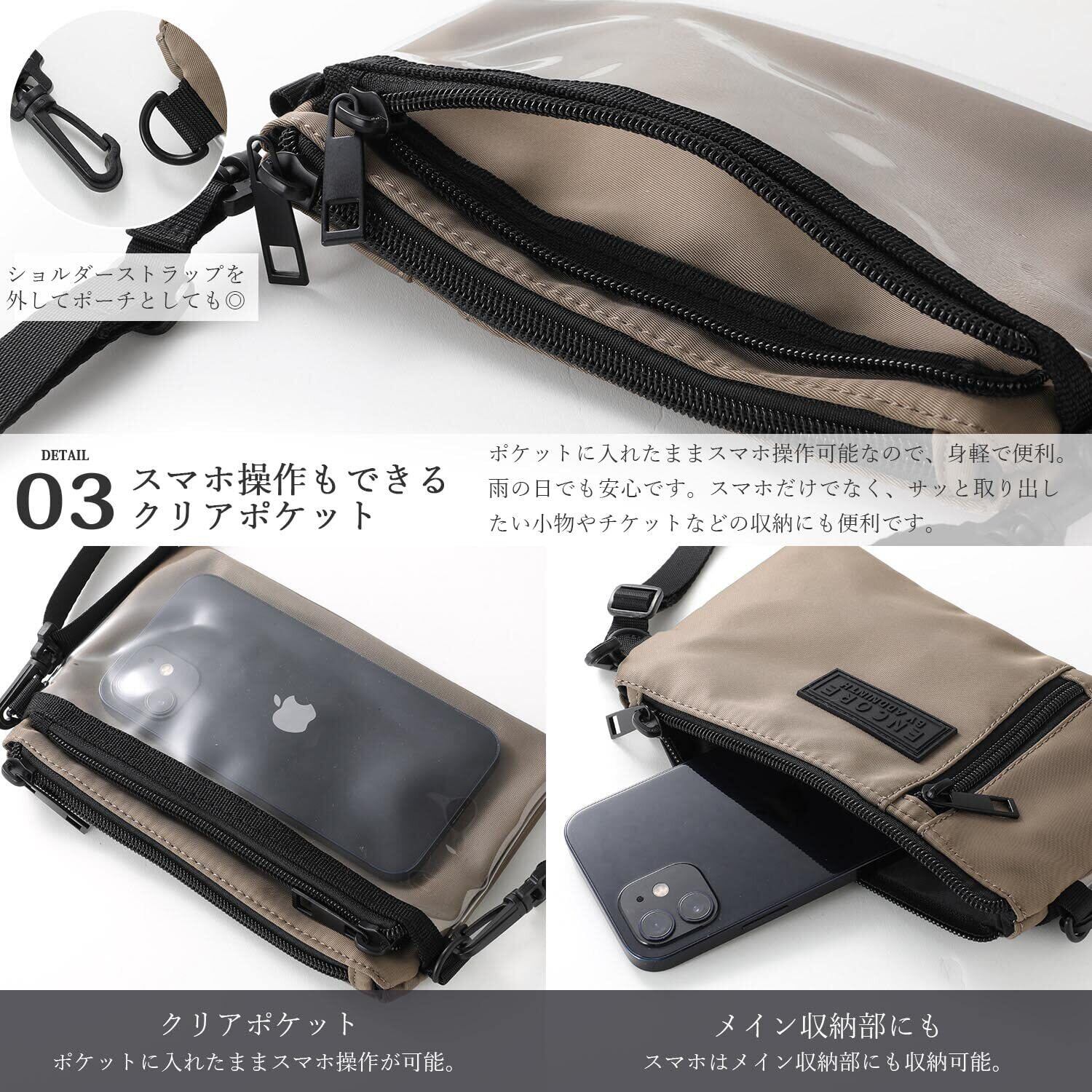 【スマホ操作もできるクリアポケット】 ポケットに入れたままスマホ操作可能なので、身軽で便利。 雨の日でも安心です。スマホだけでなく、サッと取り出したい小物やチケットなどの収納にも便利です。 【ショルダーストラップ】 ショルダーストラップは長さ調整が可能。 取外しができるので、肩掛けや斜め掛けはもちろん、ポーチとしてバッグに収納も可能。