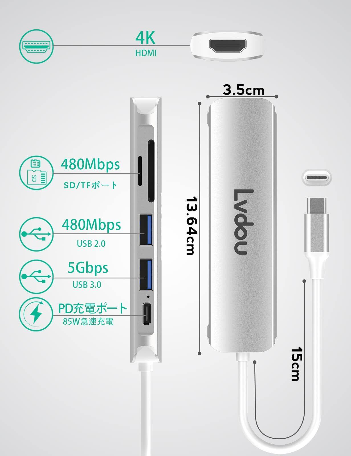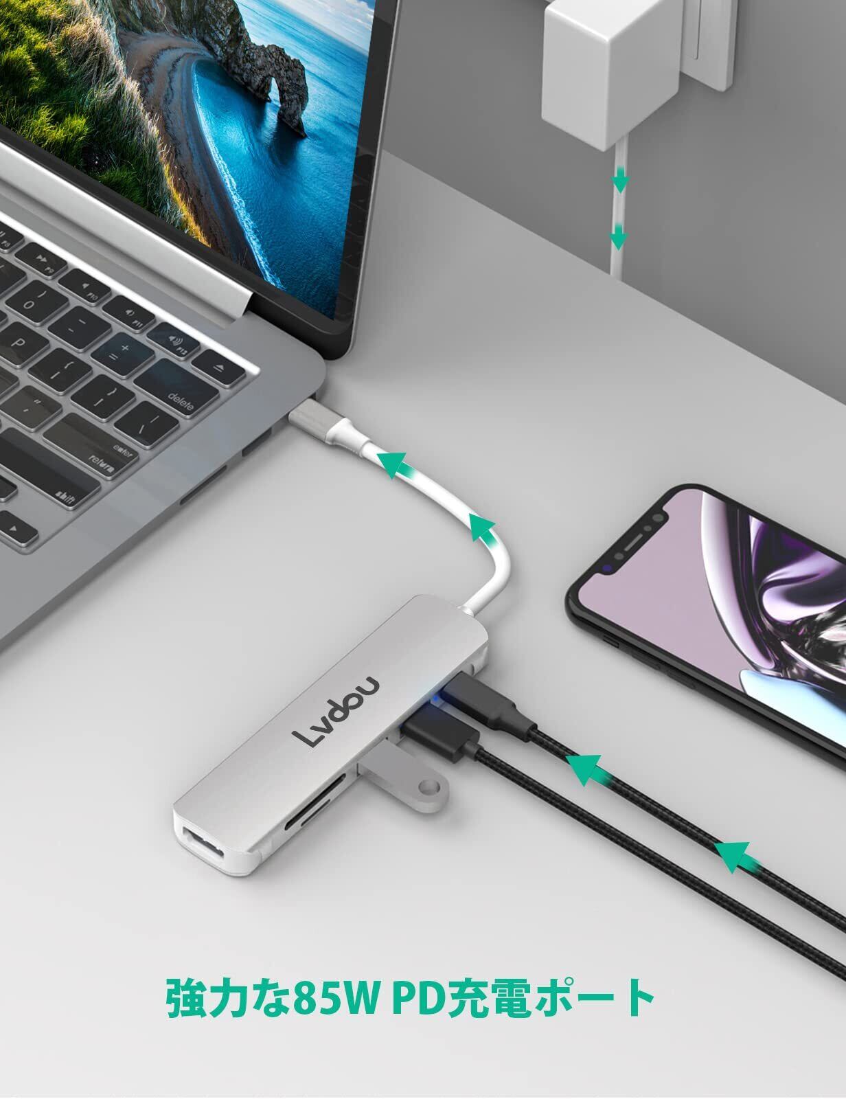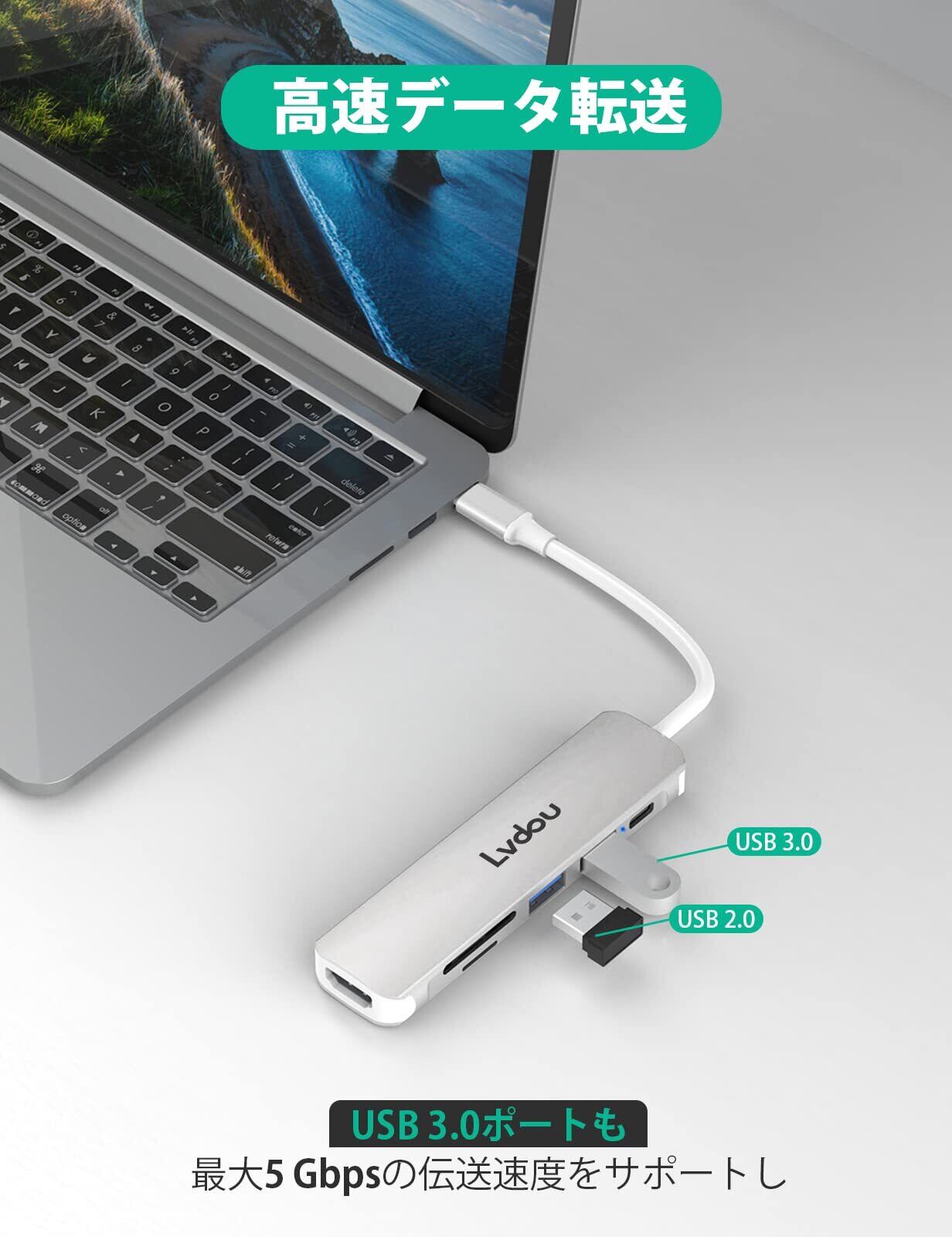 Lvdou USB C ハブ 6-in-1 Type-C アダプタ|100W PD充電・4K HDMI・MicroSD/SDカードリーダー・USB 3.0ポート搭載|MacBook Pro/Air (2016-2024)、iPad Pro (2018-2024)、iPhone 15/16、Surface Pro 9/8/7/Go、Chromebook対応 ノートPC/タブレット用|適格請求書発行可