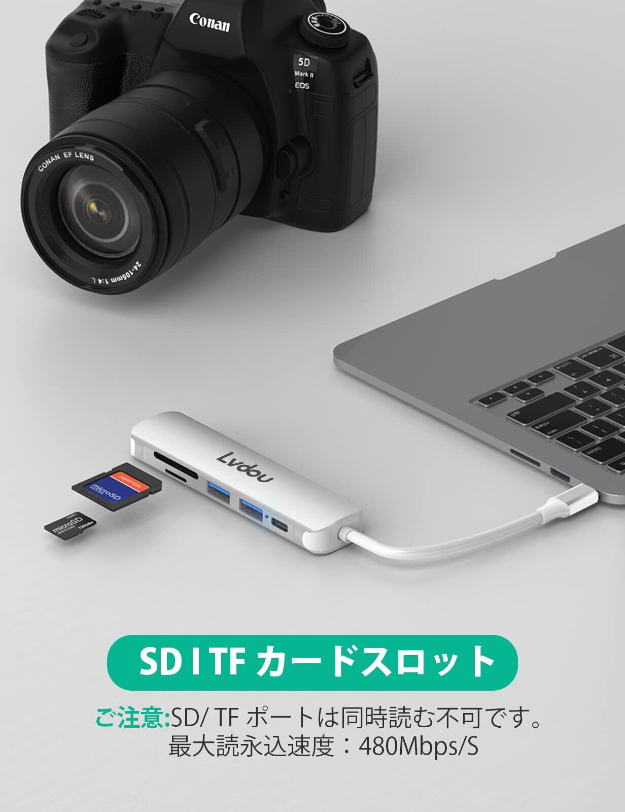 『SDカード、USB3.0対応』:USB3.0/2.0ポートが付属しますので、最大5Gbpsの伝送速度をサポートし、データとHD動画を数秒で転送できます。 SD カードとTF カードのスロットを搭載し、最大読込み速度は480mbpsです、動画やデータのスムーズな伝送が可能です、ほとんどのSDカードに対応しています。 ご注意:SD/ TF ポートは同時読む不可です。 【ご注意】 一部のSDカード、特殊解像度モニター、またはUSB-C仕様が異なる機器では正常に動作しない場合があります。その場合は機器設定や互換性をご確認ください。