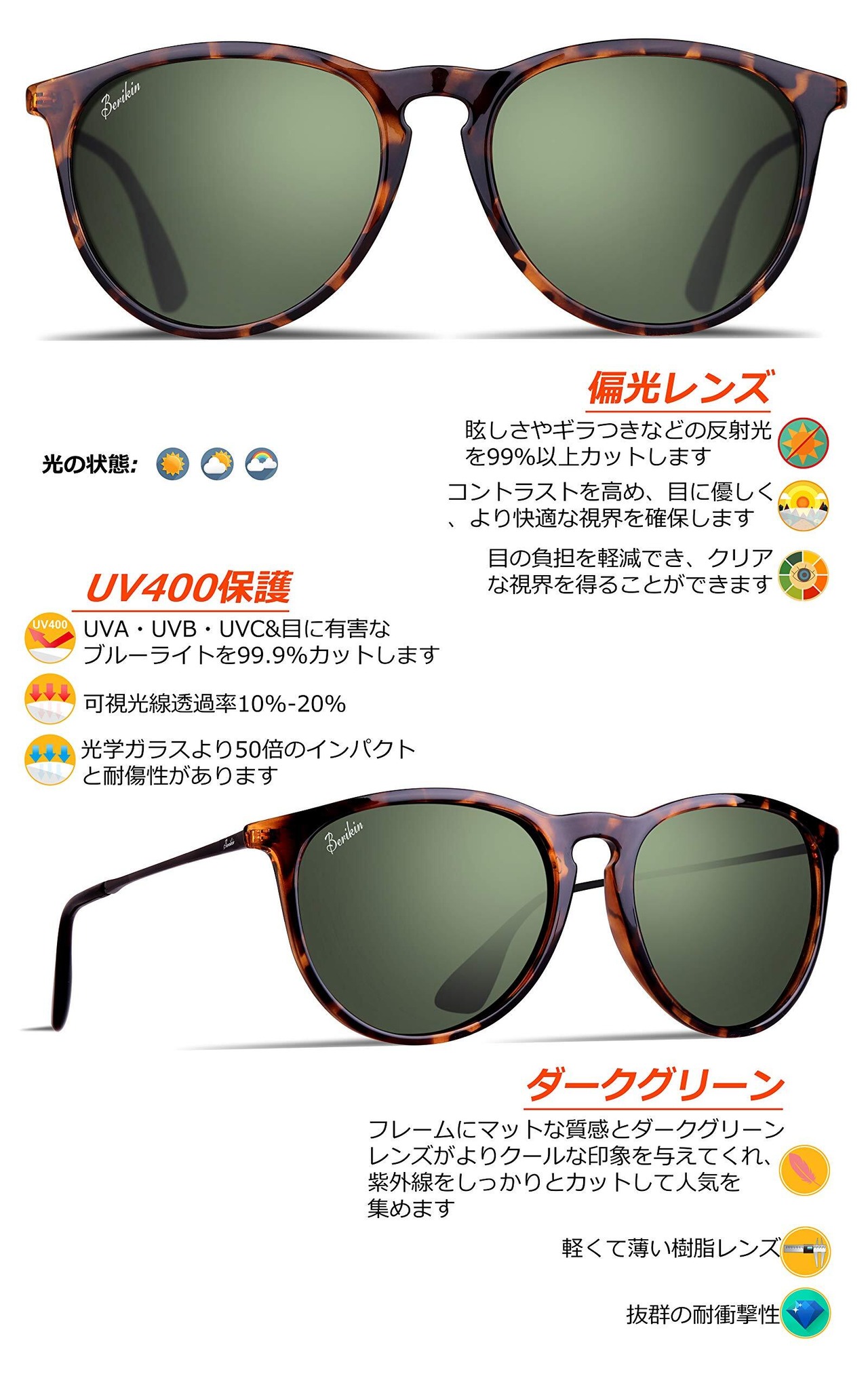 サングラス 超軽量19g 偏光レンズ メンズ レディース UV400 UVカット 紫外線カット エリカ sunglass for men women (べっこう(艶あり)/ダークグリーン)