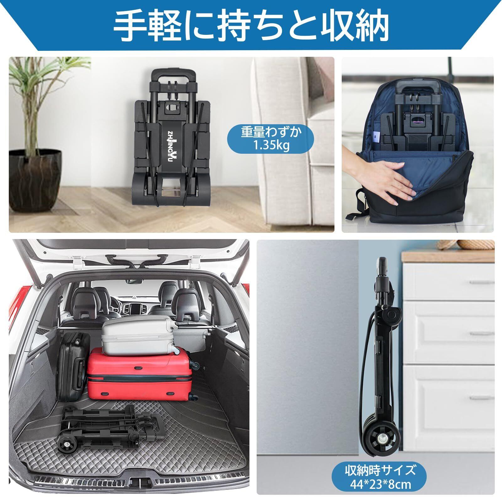 【軽量で極めてコンパクトな設計】収納時のサイズは約44×23×8cmと非常にコンパクトで、車のトランクや玄関の狭いスペースにもすっきり収まります。重量はただ1.35kg!!バックパックにも収納可能なため、このキャリーカートの持ち運びや保管が簡単です