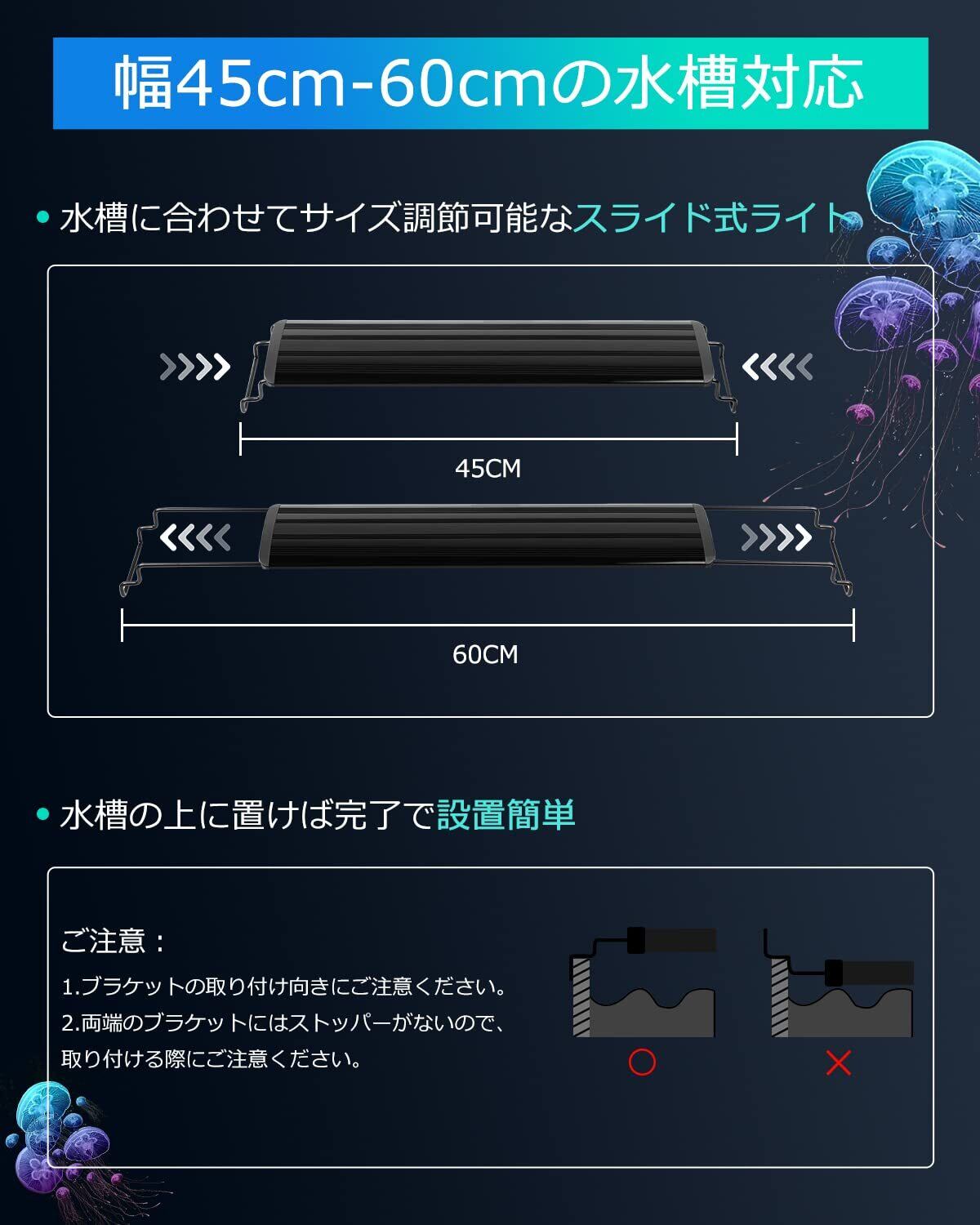 【幅45-60CMの水槽対応 】ブラケットにより、伸縮できて、45-60CMの水槽に使用可能です。取付け作業も簡単にできます、水槽に直接置くだけでいいです。(両サイドのブラケットにはストッパーがありませんので、取り付ける際に注意してください。)(ご注意:アダプタ―は防水設計ではない、水槽ライトは屋外でご利用しないでください。)