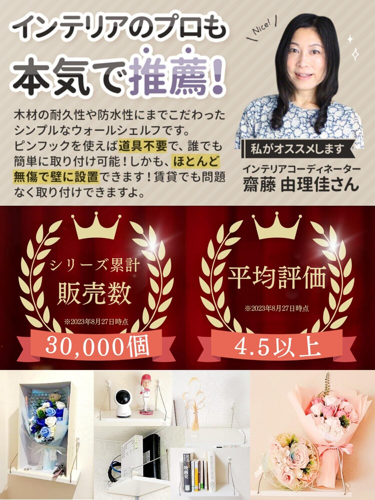 《インテリアコーディネーター齋藤理佳さんのコメントより抜粋》木材の耐久性や防水性にまでこだわったシンプルなウォールシェルフです。ピンフックを使えば道具不要で、誰でも簡単に取り付け可能!しかも、ほとんど壁を傷つけません! 賃貸でも問題なく取り付けできますよ。着脱式の落下防止ガードも付属しているから、落下も徹底防止します!