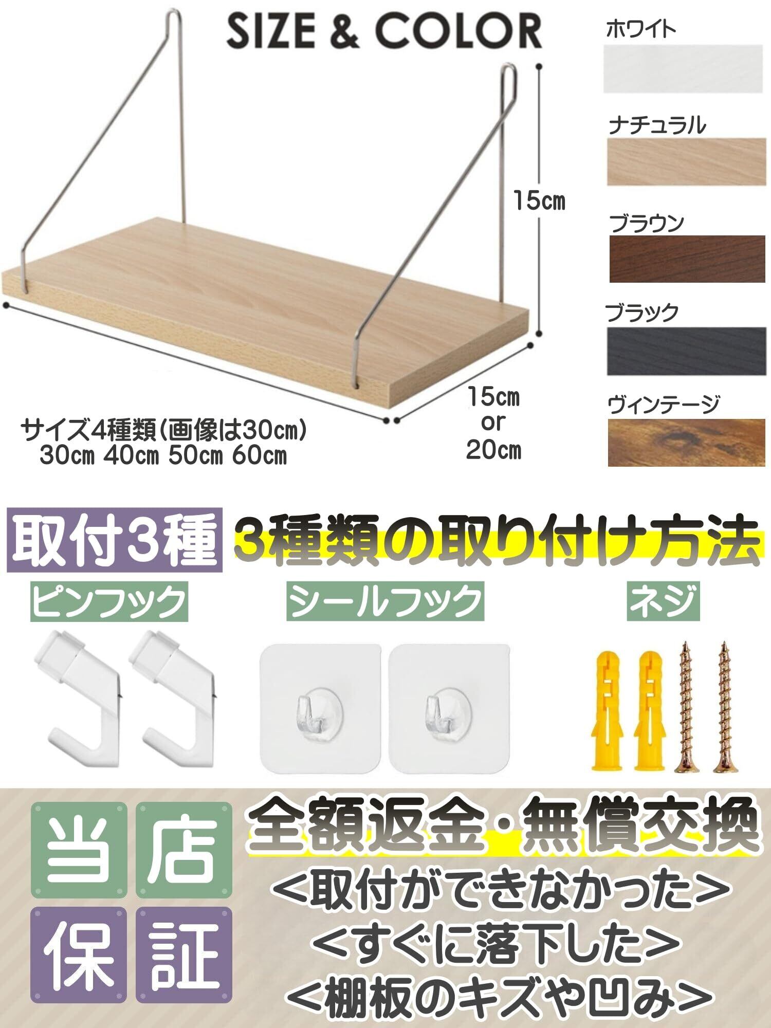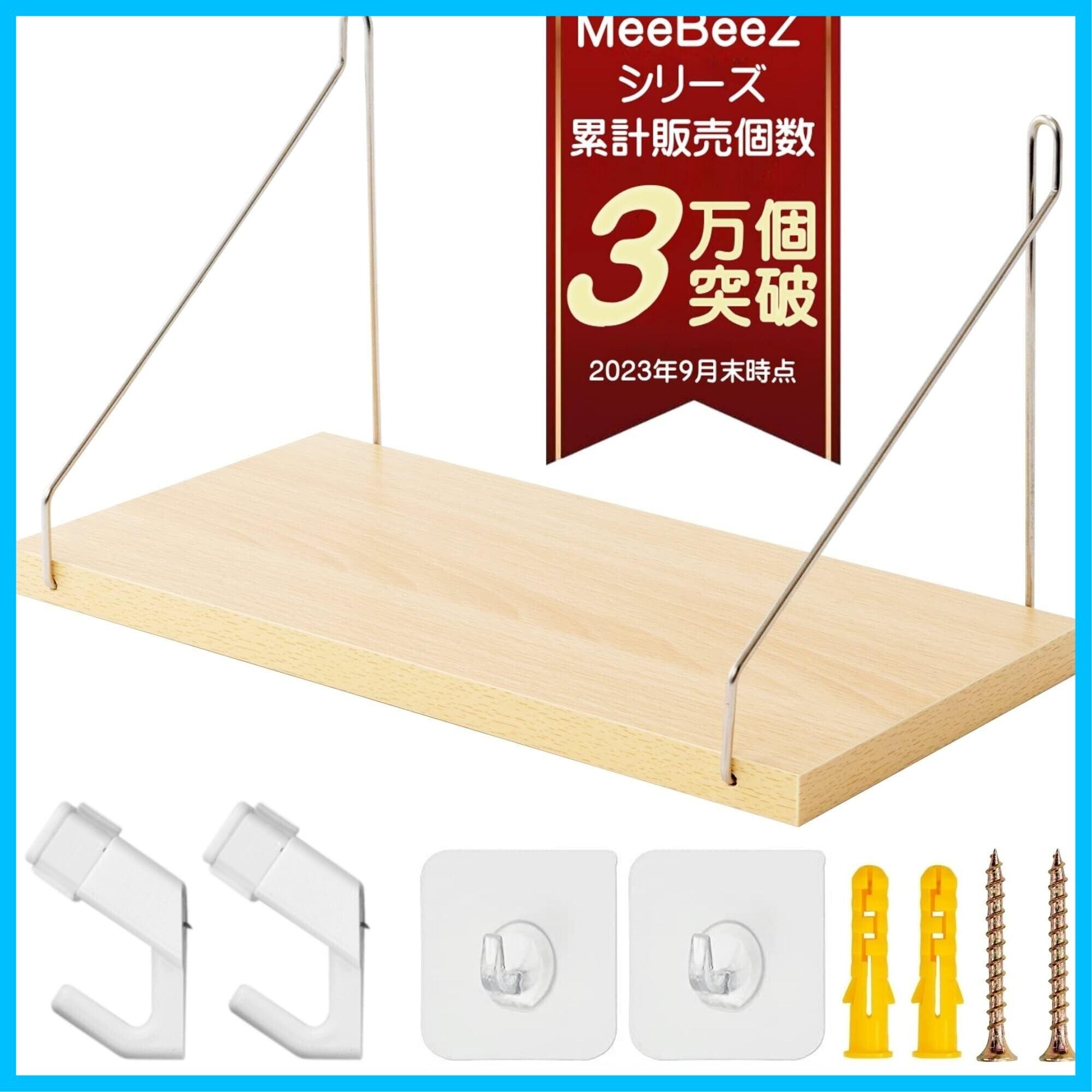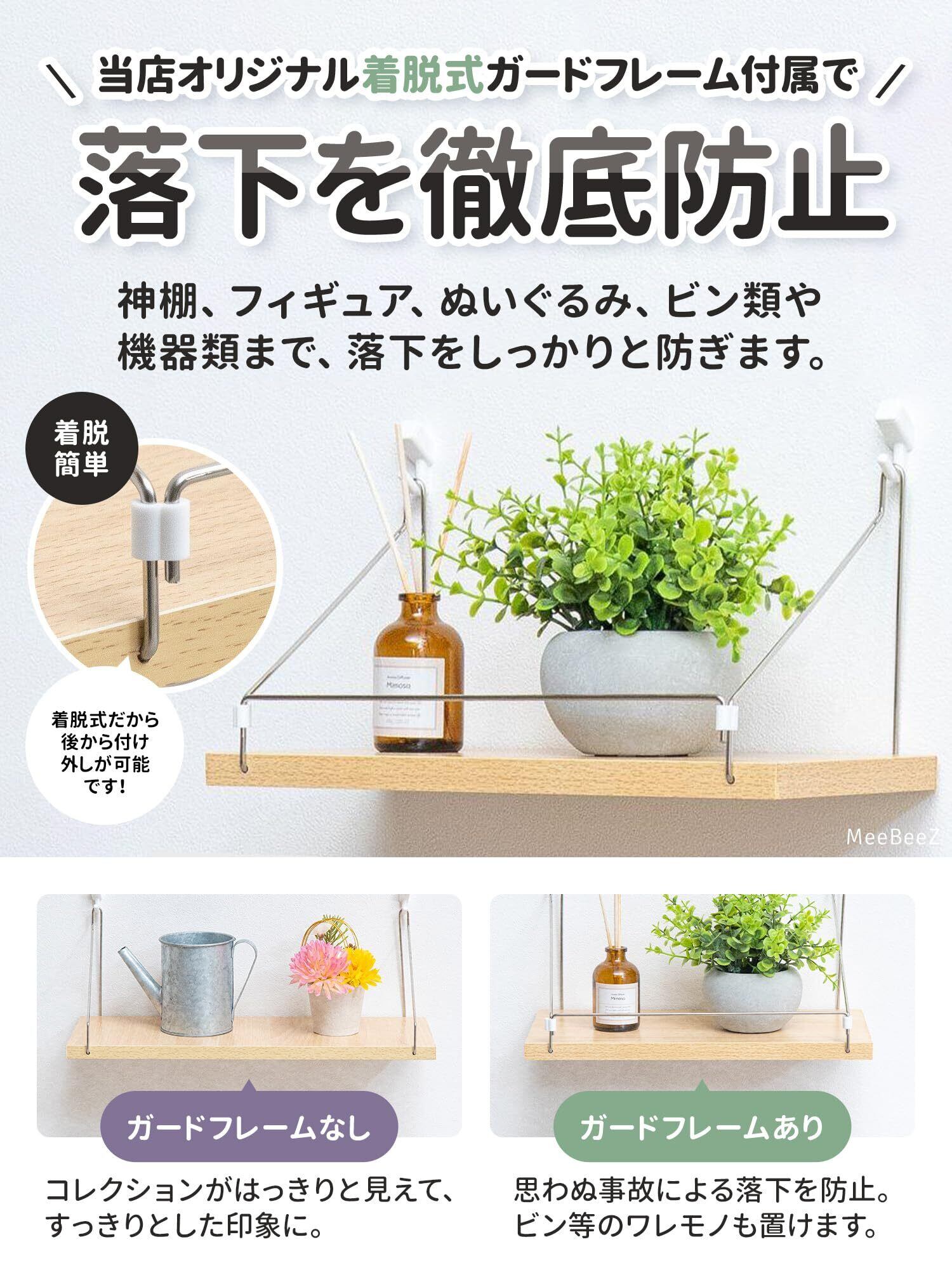 【商品仕様】○サイズ:幅(30cm or 40cm or 50㎝ or 60㎝)× 奥行(15cm or 奥行20cm) × 高さ(15cm) ○カラー:ナチュラル/ホワイト/アッシュブラウン/ブラック/ブラウン/ヴィンテージ ○セット内容:ウォールシェルフ本体×1、取付け用ネジ×2、石膏ボード用アンカー×2、ピンフック×2、落下防止ガード、日本語取扱説明書 ○素材:木材 ステンレス ○耐荷重:3-10kg ○ブランド:MeeBeeZ ※1枚目のメイン画像は30㎝幅になります。