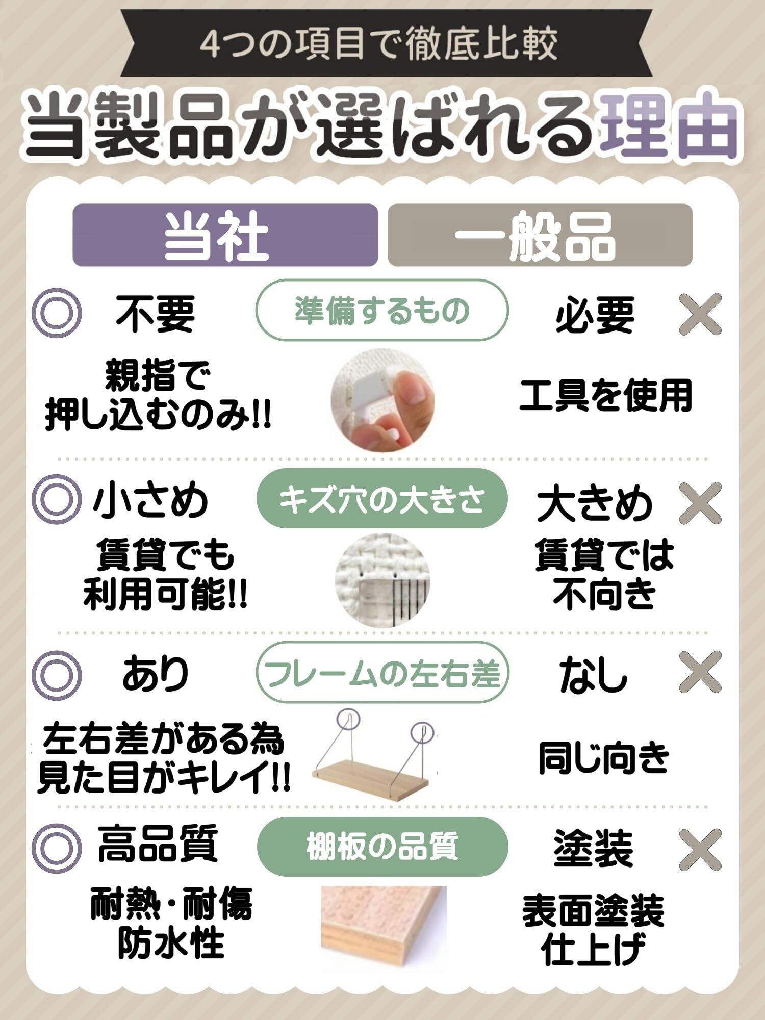 【製品の特長】《事前準備の必要なし》ピンフックを使用する場合は、ドライバーなどの工具もいりません。《壁はほぼ無傷》棚を設置した際のキズはほとんど残りません、ほぼ無傷です。賃貸物件にも◎《落下を徹底防止》落下防止ガードが付属!《フレームの左右差》棚を丁度真正面から見たときにバランス良く、美しく見えます。