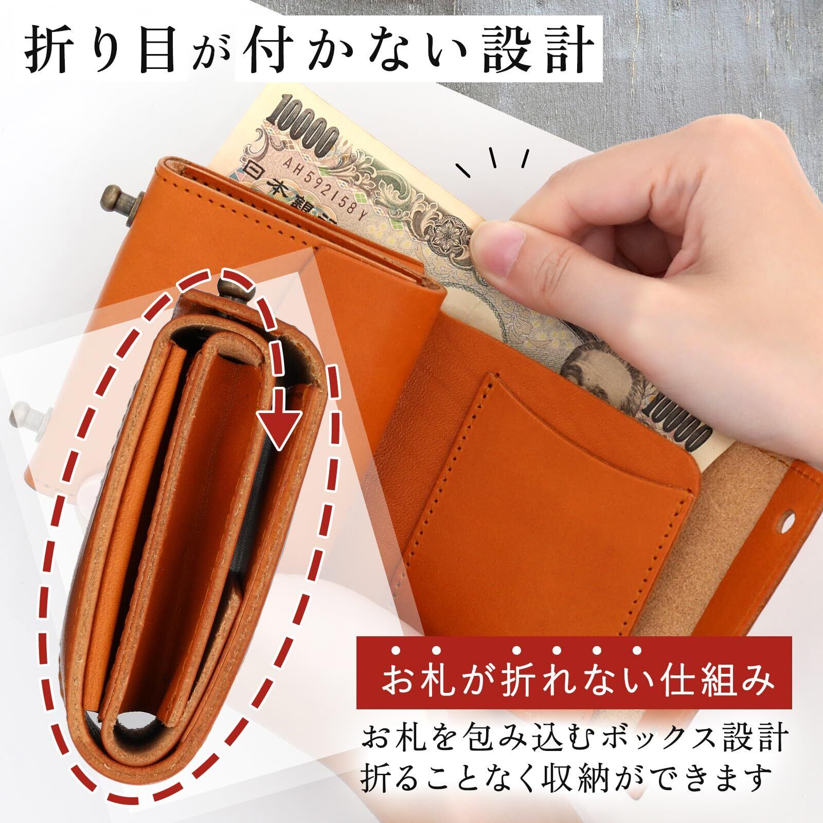 三つ折り財布だけどお札に折り目がつかないよう包み込むような設計にしています。