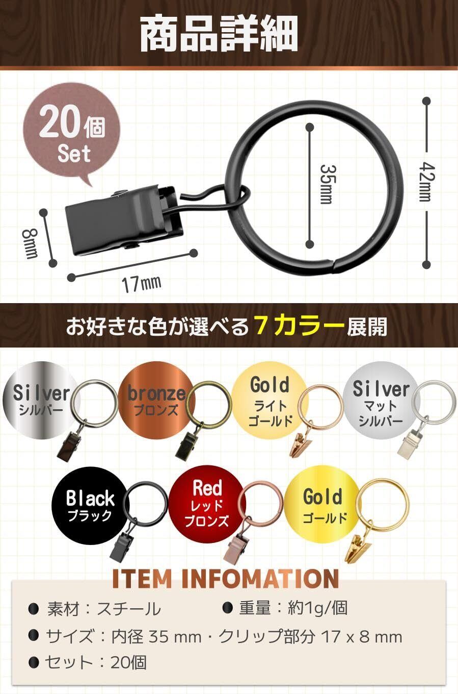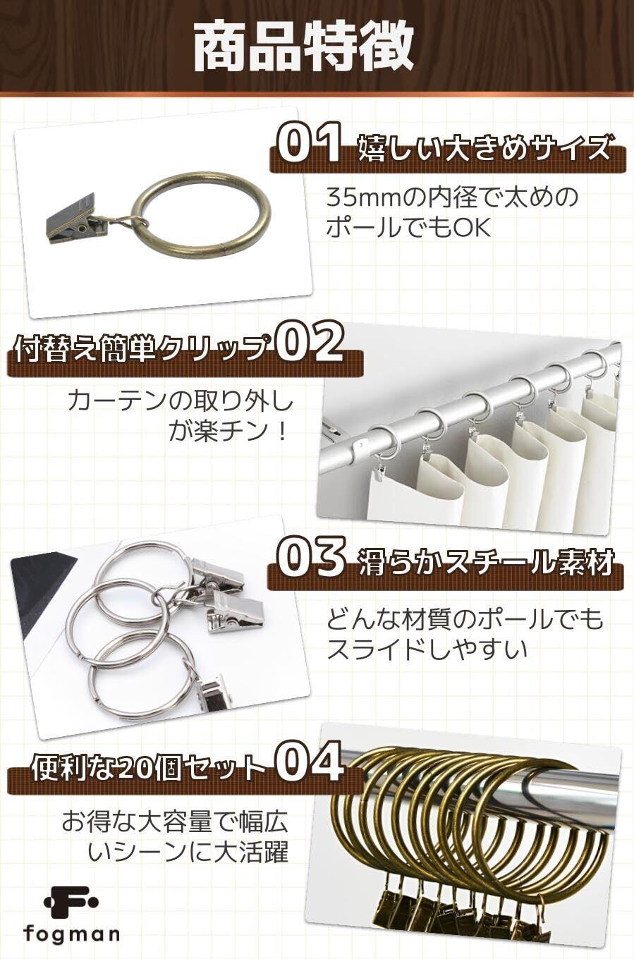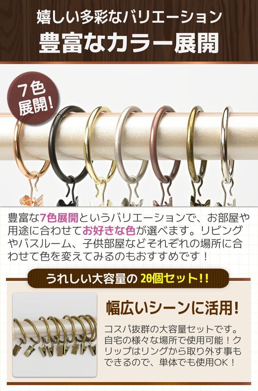 【商品特徴】①嬉しい大きめサイズ:35mmの内径で太めのポールでもOK/②付替え簡単クリップ:カーテンの取り外しが楽チン!/③滑らかスチール素材:どんな材質のポールでもスライドしやすい/④便利な20個セット:お得な大容量で幅広いシーンに大活躍