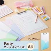 Pastyファイルシリーズ・ペンケースと合わせてカラー統一や組み合わせが楽しめる!<br>表紙ポケットにA4プリントから付箋などの小物類を収納でき、一時保管や持ち運び便利なパステルカラーのクリップファイル。