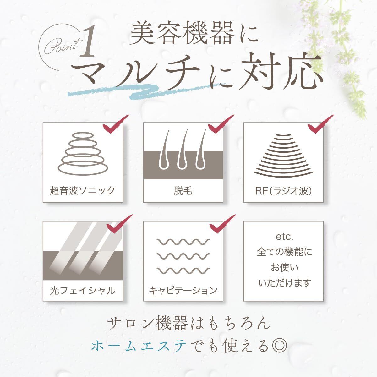 【美容機器にマルチに対応】RF(ラジオ波)、光美容、キャビテーション、美顔トリートメントケア、超音波ソニックなど様々な美容機器にお使いいただけます。サロン機器はもちろん、ホームエステでもお使いいただけます。