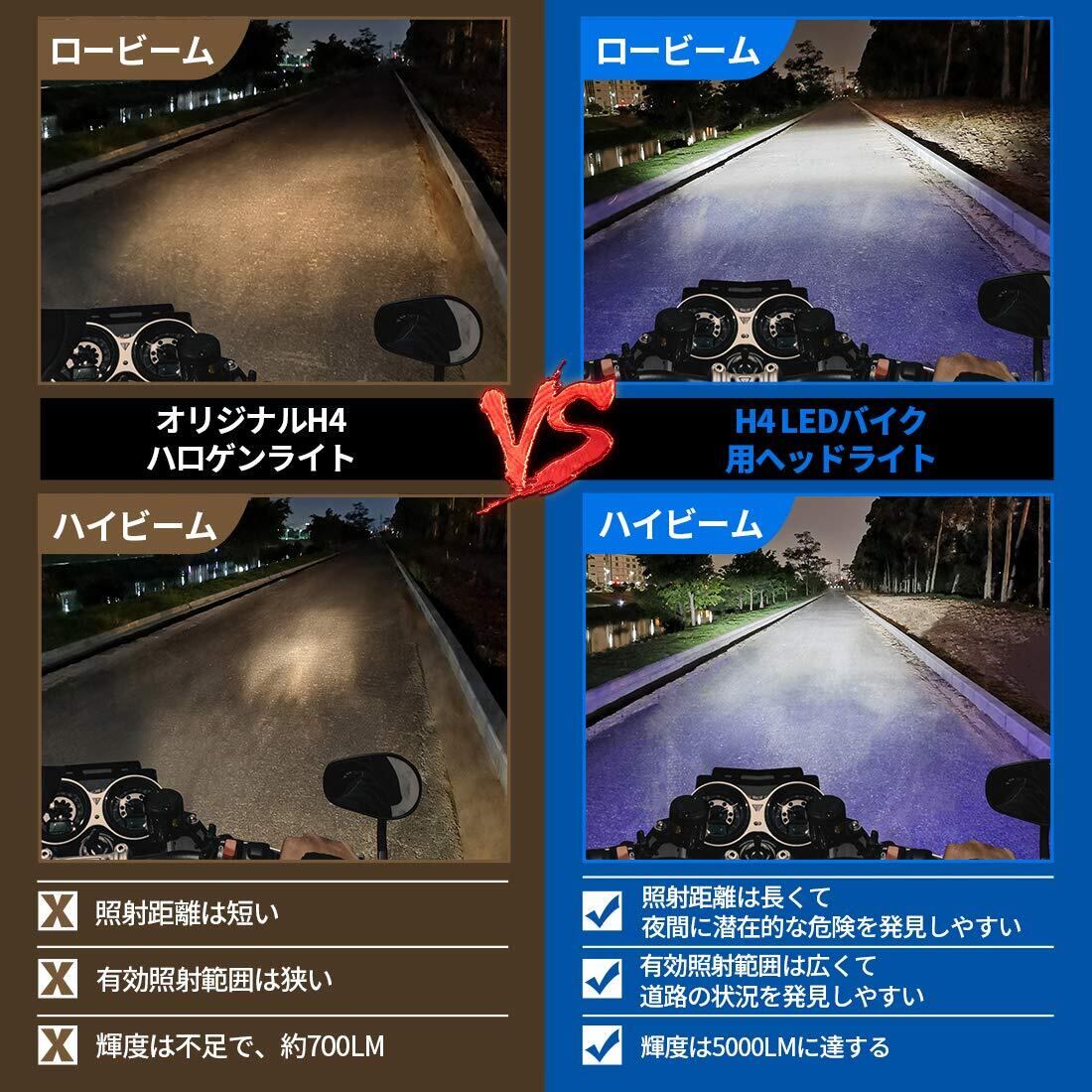 【高輝度、高効率】H4 バイク用ヘッドライトは2組の30W高効率CREEバルブを採用。明るさは5000LM。ハロゲンランプと比べると3倍以上の明るさです。また消費電力は50%。高効率で環境を保護します。LEDバイク用ヘッドライトは元々装備されているハロゲンライトと完全な互換性を保ち、かつライトの光が分散しません。