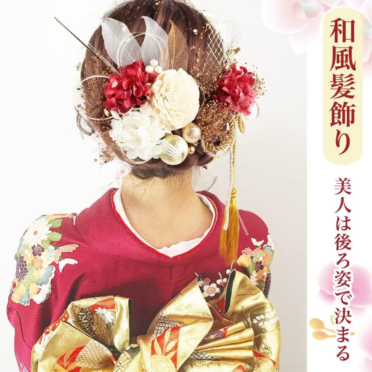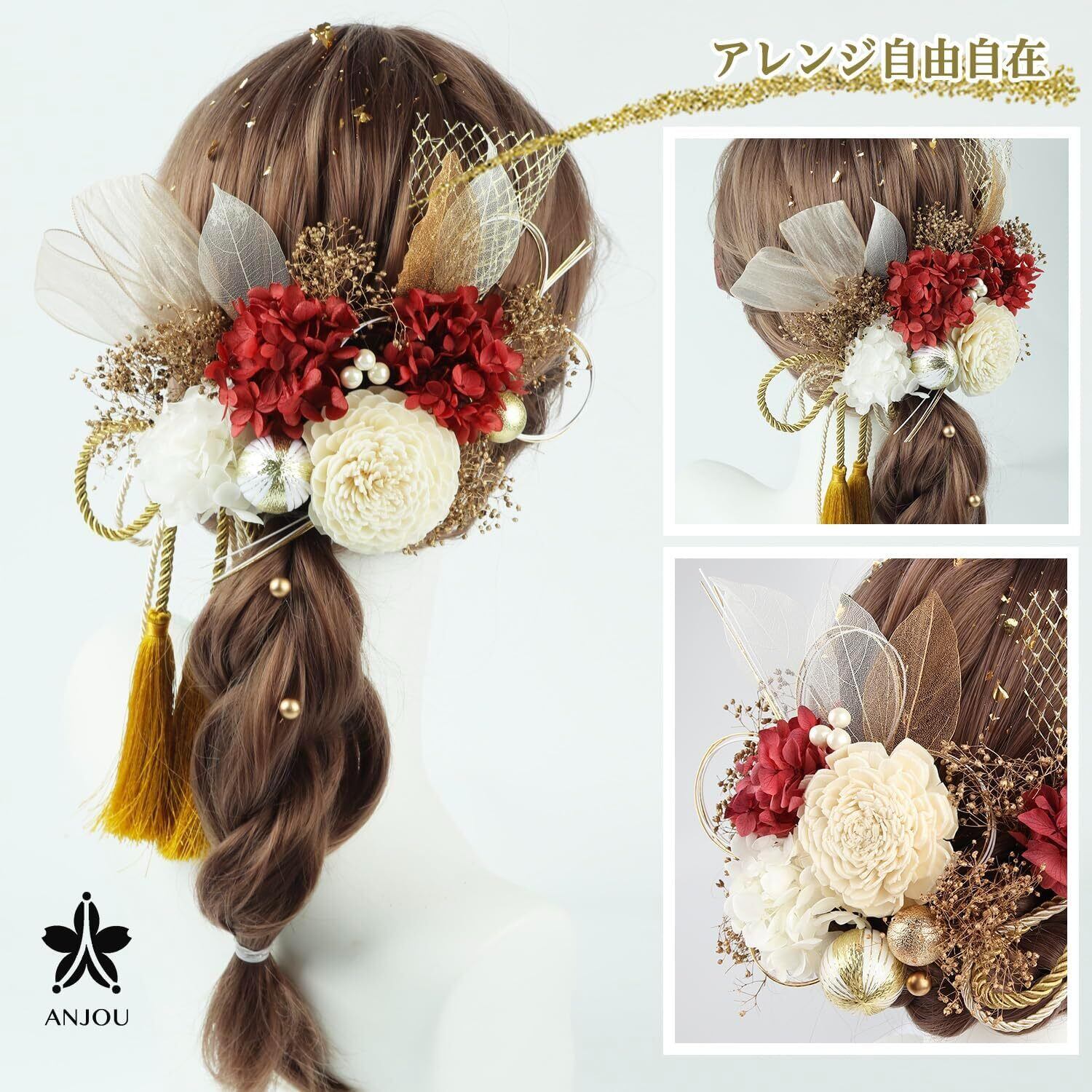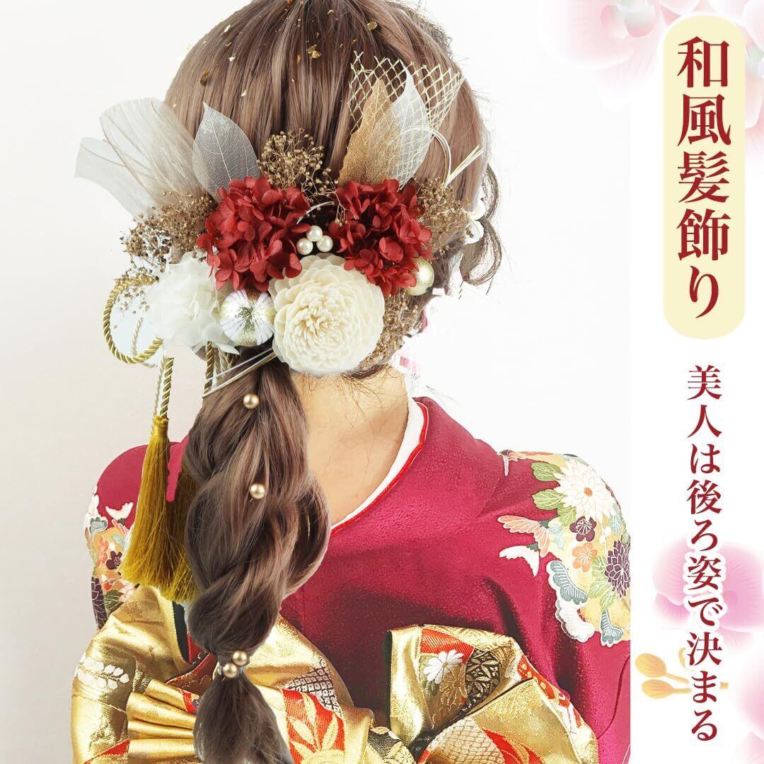和風髪飾り 成人式 和装 髪飾り ダリア 造花飾り 和玉 赤 ヘアアクセサリー ゴールド 水引 ヘッドパーツ あじさい 網型飾り リボン 振袖 着物 卒業式 七五三 浴衣 袴 結婚式 かすみ草 造花 専用ケース付き (red)